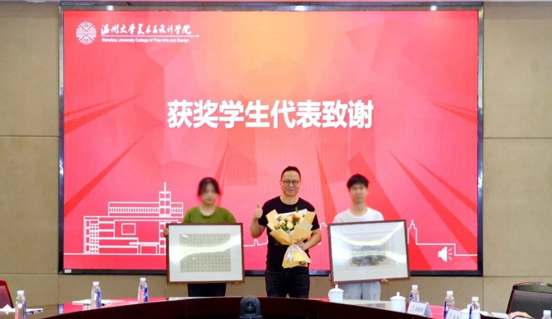 在颁奖仪式上,校党委书记钱强、校党委副书记庄兴忠赠送精美画作向刘军校友表示感谢,获奖学生代表怀着满心的感激之情向刘军校友致谢。