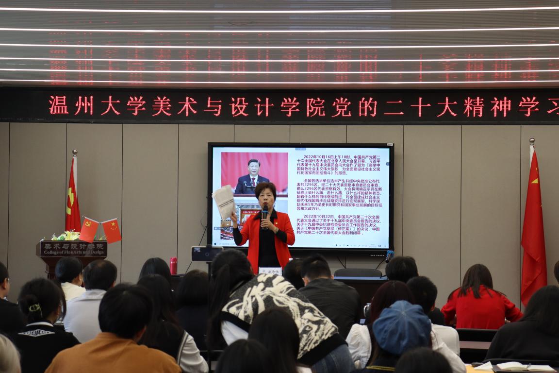 为深入学习宣传贯彻党的二十大精神,感悟思想伟力,汲取奋进力量,引导全院师生切实把思想和行动统一到党的二十大的精神上来,10月26日下午,努努影院 组织开展党的二十大精神学习会,特邀党的十九大代表宋玲华同志为学院全体师生作“学习感悟党的二十大精神”专题宣讲报告。会议由学院党委书记叶正飞主持,近500名师生线上线下参加学习活动。 宋玲华老师是党的十九大代表,市妇联执委,瓯海区关工委主任,瓯海区慈善总会副会长,瓯海乡村艺术团联合会主席,宋玲华党代表工作室负责人,浙江省关心下一代报告团成员,温州银耀瓯越宣讲员,温州老干部大学流动红色能源站讲师,宋玲华宣讲工作室负责人。 学习会上,宋老师从一名党代表的视角、一名退休党员的视角、一名公益先锋的视角,全面分析讲解党的二十大报告内容,分享了二十大精神的内涵理解和学习体会。她指出党的二十大是在全党全国各族人民迈上全面建设社会主义现代化国家新征程、向第二个百年奋斗目标进军的关键时刻召开的一次十分重要的大会,是一次高举旗帜、凝聚力量、团结奋进的大会,在党和国家发展进程中具有极其重大的历史意义。党的二十大报告,为党和国家事业描绘了清晰的发展路线,擘画了宏伟的发展蓝图,充分彰显了我们党坚如磐石的历史自信、举旗定向的政治担当和高瞻远瞩的战略视野,是我们党团结带领全国各族人民在新时代新征程坚持和发展中国特色社会主义的政治宣言和行动纲领。 “我要把党的‘好声音’传递到基层群众,传递给青年学生,这是我的职责和使命。”宋玲华老师在宣讲过程中也分享了多年来践行一名共产党员初心使命的经历,从丰富地方群众的文化生活到宣讲低碳环保的生活方式,从省吃俭用捐助困难群众到关爱帮扶失足少年,从退休党员干部到十九大党代表……,希望通过自己的付出和行动,带动更多人做对社会有益的事。 学习会上,宋玲华老师用习总书记的话“青年强,则国家强!”来勉励师生党员,要坚定不移听党话、跟党走,怀抱梦想又脚踏实地,敢想敢为又善作善成,立志做有理想、敢担当、能吃苦、肯奋斗的新时代好青年,让青春在全面建设社会主义现代化国家的火热实践中绽放绚丽之花。 叶正飞书记总结指出,学习好宣传好贯彻好党的二十大精神是当前和今后一个时期学院的首要政治任务。新时代新征程,全院师生要深学细悟党的二十大精神,要把坚决拥护“两个确立”转化为坚决做到“两个维护”的实际行动,要聚焦“争当表率、争做示范、走在前列”光荣使命,奋力推动学院高质量内涵式发展,为全面建设社会主义现代化国家、全面推进中华民族伟大复兴作出更大贡献!