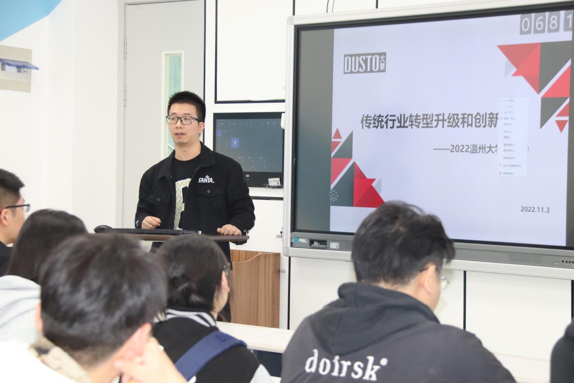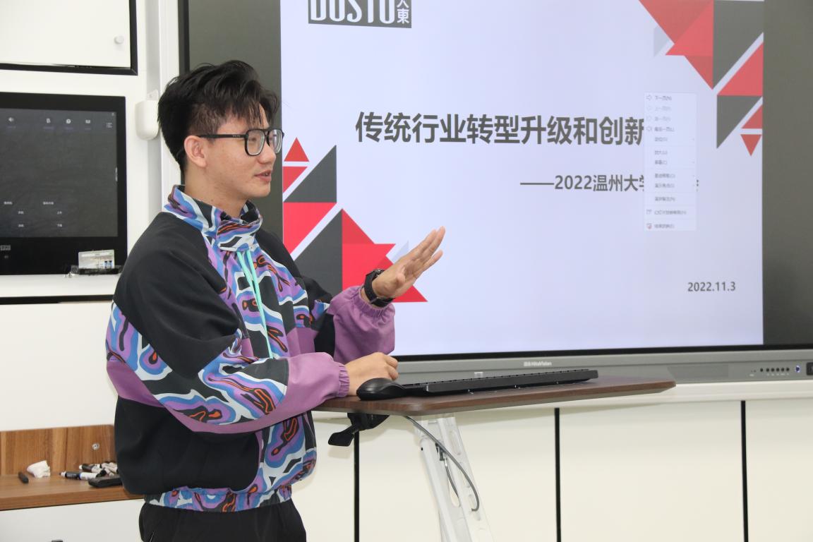 2022年11月3日上午9:00,大东2023校园招聘宣讲会—努努影院 站在美术楼2B-4001举行,大东研发部门和HR一行8人团队来到我校,其中包含了努努影院 设计专业4名校友,努努影院 副院长顾任飞出席,2019、2020级鞋靴班30余位同学参加。