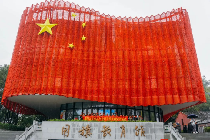 为深入贯彻习近平新时代中国特色社会主义思想,认真贯彻落实党的二十大精神,2022年11月2日下午,努努影院 学生党员来到了全国首家综合性国旗教育馆——瑞安国旗教育馆,开展“赓续红色血脉 奋进时代征程”主题党日活动。党员们在五星红旗前行注目礼,在巨幅屏幕前体验了一次特殊的升旗仪式,在慷慨激昂的国歌声中齐声合唱,在校友曾联松先生的雕像前追忆国旗的设计历史……凝视着鲜艳的五星红旗,更加坚定了党员们奋进的步伐。 瑞安国旗教育馆位于西山之巅,总建筑面积2600多平方米,其中布展面积近2000平方米。展馆共有4层,以“天圆地方、天瑞地安,鼎盛中华、红旗飘扬”为设计主题。 忆往昔峥嵘岁月,筚路蓝缕、栉风沐雨,不变的是鲜红的旗帜,不变的是华夏儿女赤诚的初心。移步至国旗诞生厅内,讲解员向大家讲述了设计者曾联松从缘起到邂逅、与五星红旗之间的故事。通过五星红旗诞生的故事,党员重温了国旗的设计理念。了解国旗的制作、国旗的涵义、国旗的标准等内容,感受“一旗、一人、一馆、一城”的情缘。 五星红旗在设计上非常讲究,整体布局中偏庄严庄重。该旗采用非对称的设计,旗面左上方缀五颗黄色五角星。一星较大,其外接圆直径为旗高十分之三,居左;四星较小,其外接圆直径为旗高十分之一,环拱于大星之右。利用向心角度变化每一个角都能指向大的五角星,星布成椭圆形,大星导引于前,小星环绕于后,恰似众星拱北斗的红地五星旗,同时以大小之势,呈现出了这组图案的张力与立体感,并在视觉感官上给人以协调和平衡。同时五星红旗又叫红地五星旗,红色代表革命,五颗红星象征着中国革命人民的大团结,是中华人民共和国的象征和标志。它见证着牺牲与奉献,代表着神圣与崇高,寄托着热爱与自豪。 浩渺行无极,扬帆但信风。学生党员们在党旗前重温入党誓词,在馆内外唱响《我爱你,中国》,表达青年学生党员的爱国情、强国志、报国行。 本次主题党日活动,以国旗为主线引导党员深入了解红色政权来之不易、新中国来之不易、中国特色社会主义来之不易,回顾中国共产党带领祖国崛起的历史性时刻。作为新时代的美院学子,曾联松先生让后辈感受到了青年匠人需要的担当和使命。激励青年党员将不断提高专业技能,加强党史学习,提升党性修养,不忘初心,砥砺前行,不负新时代,做好答卷人。