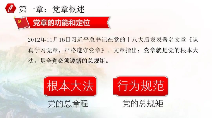 《中国共产党章程》是中国共产党为实现党的纲领所制定的根本法规,是党的各级组织和全体党员必须严格遵守的基本准则和规定。党章是统一全党思想和行动的基础、是承续党的成功经验及优良传统的纽带、是执行党的纪律的根据、是保证党的纯洁性的武器。