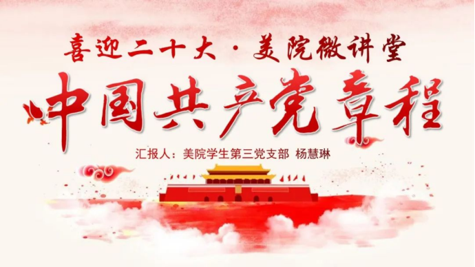 本期“喜迎二十大 美院微讲堂”活动由温大美院学生党员杨慧琳进行宣讲,带领大家学习党章的基本内容。中国共产党第十九次全国代表大会,对中国共产党章程又做了多方面的重要修改。主要是体现了十八大以来马克思主义中国化的最新发展成果,体现了以习近平同志为核心的党中央治国理政新理念新思想新战略,体现了坚持和加强党的领导、全面从严治党的经验。