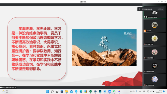 01 课程介绍宣讲人:沈佐伦本期“喜迎二十大 美院微讲堂”活动由温大美院学生党员沈佐伦进行宣讲,带领大家学习共产党人的初心和使命。习近平总书记强调了初心和使命的重要意义。中国共产党在那么弱小的情况下能够逐步发展壮大起来,在腥风血雨中能够一次次绝境重生,在攻坚克难中能够不断从胜利走向胜利,根本原因就在于不管是处于顺境还是逆境,我们党始终坚守为中国人民谋幸福、为中华民族谋复兴这个初心和使命。02 活动方式活动时间:2022年9月25日18:30-19:30活动地点:线上 03 课程回顾七一勋章案例介绍坚持志愿服务十余载,群众心中的“活雷锋”王兰花,女,回族,1950年6月生,1995年11月入党,宁夏吴忠人,宁夏回族自治区吴忠市利通区金星镇王兰花热心小组党支部书记、王兰花热心小组慈善协会会长。群众心中的“活雷锋”,把解决社区居民的操心事,烦心事,揪心事作为毕生事业,十多年如一日坚持志愿服务。带领"王兰花热心小组”先后为居民解决各类困难7000多件,调解各类民事纠纷600多起,开展公益活动7000多场次,推动利通区志愿者从最初7人发展到6.5万余人。荣获“全国三八红旗手标兵”、“全国民族团结进步模范个人”等称号。 初心,使命的要求不忘初心方能行稳致远,牢记使命才能开辟未来。习近平总书记指出:我们党正带领人民进行具有许多新的历史特点的伟大斗争,必须不断深化党的自我革命,持续推动全党不忘初心、牢记使命。在未来的征程上,广大党员干部只有更好地守初心、担使命,把理想信念转化为攻坚克难的强大力量,万众一心,我们才能走好新时代的长征路,实现中华民族伟大复兴的中国梦。 青年大学生的初心和使命学海无涯、学无止境,学习是一件没有终点的事情,党员干部要不断加强政治理论知识学习,不断提高政治意识、大局意识、核心意识、看齐意识,永做党的坚定拥护者:要学以致用、知行合一,在学习和实践中不断解答疑难困惑,在学习和实践中不断收获成功喜悦,在学习和实践中不断坚定理想信念。 04 心得体会21美师1 沈柯莹本次微讲堂的主题是:不忘初心,牢记使命,高举中国特色社会主义伟大旗帜,决胜全面建成小康社会,夺取新时代中国特色社会主义伟大胜利,为实现中华民族伟大复兴的中国梦不懈奋斗。“不忘初心,牢记使命”就是为中国人民谋幸福,为中华民族谋复兴。主讲人列举了三位不忘初心牢记使命的人物:点亮贫困山区女孩梦想的“校长妈妈”张桂梅、坚持志愿服务十年余载,群众心中的“活雷锋”王兰花、做工人要做到最好,我国焊接领域“领军人”艾爱国。让我感触最深的是“校长妈妈”张桂梅,十年树木百年树人,张桂梅用自己的教育初心,通过19年的努力实践创造了一个又一个教育奇迹,她知行合一,身体力行,用行动向我们上了“不忘初心,牢记使命”的一课。20美师3 陈淑慧本次美院微讲堂始终围绕“不忘初心,牢记使命”展开。而这句话强调的就是切实做到为中国人民谋幸福,为中华民族谋复兴。之所以“为中国人民谋幸福”作为中国共产党的核心,是因为一个政党的前途命运,最终取决于民心向背。人民是党执政之根基。而张桂梅同志则是身体力行地诠释了“为中国人民谋幸福”。张桂梅校长不畏风雨与艰险,筹资建立女子高中。她身患风寒重症,每天吃着数种药物,但这也没有阻拦她帮助贫困女孩走出大山的梦想,甚至为培养学生几乎付出生命。如同张校长一般,广大党员干部只有更好的坚守初心、担任使命,万种一心,才能走好新时代的长征路,实现中华民族伟大复兴的中国梦。19服设4 单雨欣不忘初心,什么是不忘初心,牢记使命?它是中国共产党第十九次全国代表大会的主题,它强调的是共产党人的初心和使命——为中国人民谋幸福,为中华民族谋复兴。这个初心和使命就是激励党和人民不断前进的根本动力。这是全体党员、干部的终身课题,因此我们必须用马克思主义中国化最新成果统一思想、统一意志、统一行动。前有点亮贫困山区女孩梦想的校长妈妈,坚持志愿服务十余载的活雷锋,现在有奔赴抗疫战场第一线的白衣天使,每个人都在用自己的方式来实现自己的初心和使命,作为当代大学生的我们,必须发扬斗争精神,勇于担当作为,不断坚定我们的理想信念。21美师3 王颖今天的微讲堂主要讲了十九大报告上,习近平总书记的一句话——“不忘初心,牢记使命”。微讲堂中举了三个党员的例子——他们平凡而又伟大,他们是普通人而不是天才,但却有一颗对党的衷心和对人民的热爱,他们这辈子坚持的是“全心全意为人民服务”的宗旨。其中,最令我印象深刻的是张秀梅同志。从高中的时候我就了解过她的事迹。她在面临学校办不下去的时候,发现有8个老师是党员,她就带着这8个老师在党旗下宣誓。硬是凭着这份对党的信念,把学校越办越好,把好多学生送出了大山。我觉得这就是“不忘初心,牢记使命”的真实体现。 19服设4 蔡安娜不忘初心,牢记使命,高举中国特色社会主义伟大旗帜,决胜全面建成小康社会,夺取新时代中国特色社会主义伟大胜利,为实现中华民族伟大复兴的中国梦不懈奋斗是中国共产党第十九次全国代表大会的主题,什么是不忘初心呢,就是共产党人的初心和使命——“为中国人民谋幸福,为中华民族谋复兴”,这是我从十九大中学会的,我们“不能忘记为什么