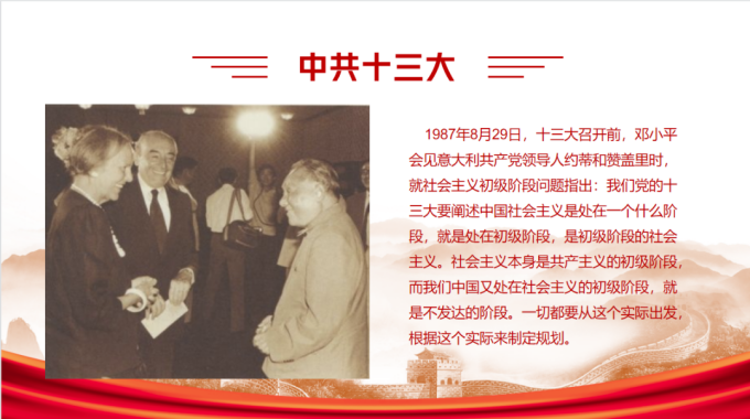 十三大正式制定了党在社会主义初级阶段的基本路线,即:领导和团结全国各族人民,以经济建设为中心,坚持四项基本原则,坚持改革开放,自力更生,艰苦创业,为把我国建设成为富强、民主、文明的社会主义现代化国家而奋斗。正式制定社会主义初级阶段基本路线,是十三大载入史册的最重要贡献。十三大制定了到21世纪中叶分三步走实现现代化的发展战略:第一步,从1981年到1990年国民生产总值翻一番,实现温饱;第二步,从1991年到20世纪末再翻一番,达到小康;第三步,到21世纪中叶再翻两番,达到中等发达国家水平。“三步走”战略把我国社会主义现代化的进程具体化为切实可行的步骤,是激励全国人民为一个共同理想而奋斗的行动纲领。十三大的另一个重要内容,是政治体制改革。根据邓小平关于政治体制改革的思想,十三大明确提出政治体制改革的长远目标是建立高度民主、法制完备、富有效率、充满活力的社会主义政治体制,近期目标是建立有利于提高效率、增强活力和协调各方面积极性的领导体制。大会提出了政治体制改革的各项任务,包括:实行党政分开,进一步下放权力,改革政府工作机构,改革干部人事制度,建立社会协商对话制度,完善社会主义民主的若干制度。