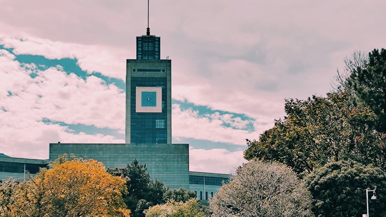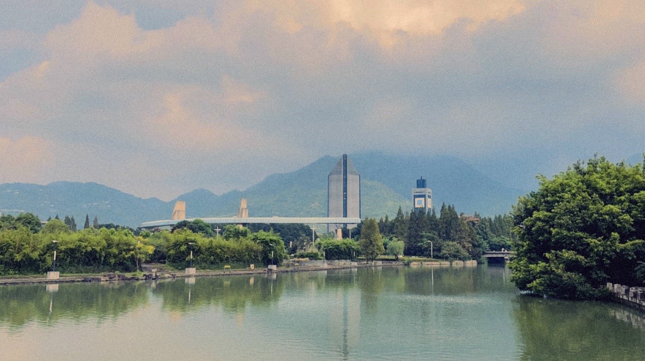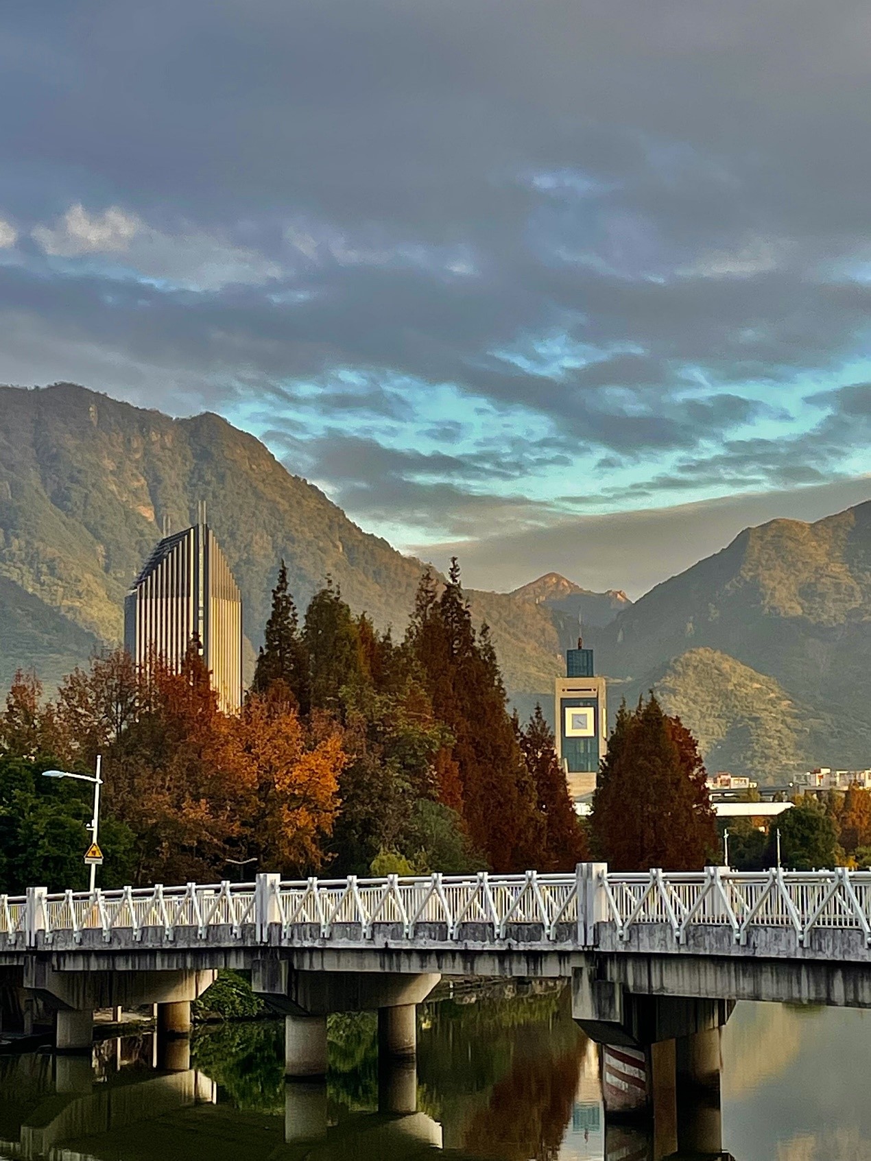 我驻足在桥边,落日余晖将金黄撒向水面、秋枫、高楼、大山……一切显得静谧而美好。大山下,是代表现代文明的高楼——图书馆。大山与图书馆相映成辉,代表当代文明的图书馆很自然地融入了这片自然之景中。自然孕育了文明,而文明证明着自然。