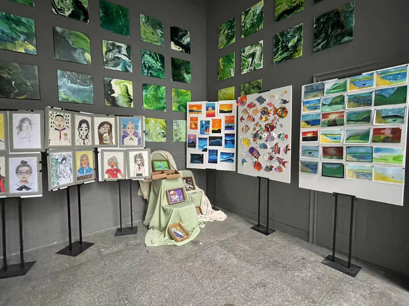 本次与实习汇报会一同进行的还有优秀实习作业展,展示了20级美师同学在实习过程中的优秀板书、学生作品,展览布置有新意,呈现了优质的教学成果!