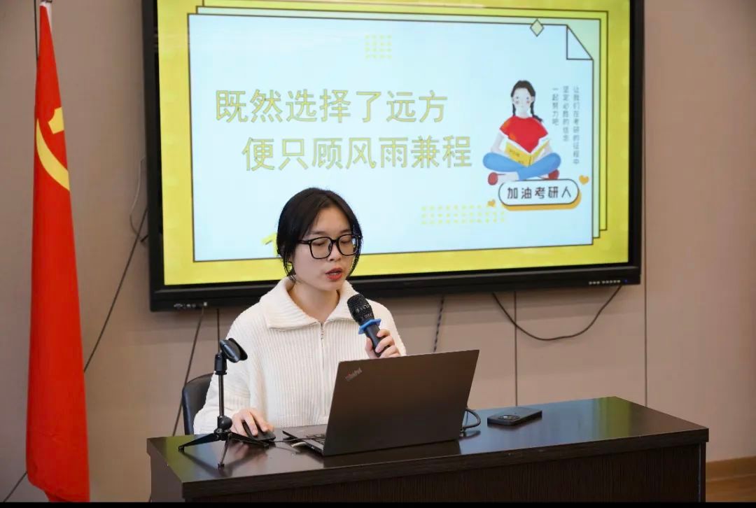 会上,努努影院 2023届研究生方晨从院校选择、学习方法和心态调整等方面分享了自己的备考经验,并鼓励学弟学妹们坚定信念,一路向前。