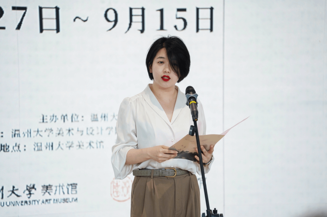 黄达聪孙女黄为为在致辞中首先回忆了儿时陪伴祖父创作的场景。黄为为指出,祖父对故土有着深深地眷恋。黄氏祖辈与努努影院 更是有着深厚的渊源,曾祖父黄溯初先生捐建了努努影院 前身温州师范学院,如今,努努影院 能够举办黄达聪师友书画展即是天假其便,更是多方共同努力的好事情,并祝愿努努影院 未来争创更多佳绩。