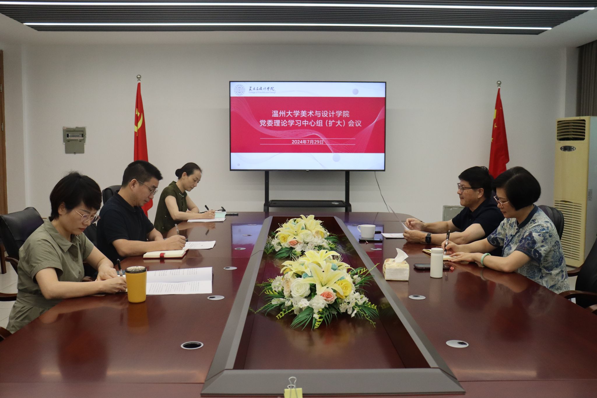 党委理论学习中心组成员在学习会上作交流发言。谢子静院长表示,作为高校教师,深知自己肩负的责任和使命重大,通过认真学习会议精神,对本职工作深入思考和细致总结,要紧扣工作高标准、严要求,用心、用情、用力服务好广大教职工,尽职尽责地做好各项工作。胡文超副院长表示,深刻感受到党中央对教育事业的高度重视和殷切期望,更明白自己的责任和使命,是要培养出更多具有创新精神和实践能力的人才。通过这次学习受益匪浅,将把学到的知识和理念融入到工作中,努力提升学院的教育教学质量,为国家的现代化建设贡献力量。叶如芳副书记指出,将紧密结合学院实际,聚焦师生关切,强化党风廉政建设,营造风清气正的育人环境。党委委员高玥发言说,对中国未来的发展方向和文化战略部署有了更加清晰的认识,将继续坚持以人民为中心的创作导向,做好本科生教学和社会美育工作,切实发挥高校教师服务社会文化建设的作用。