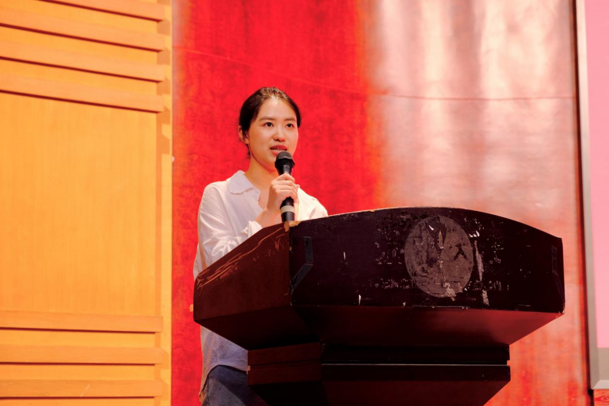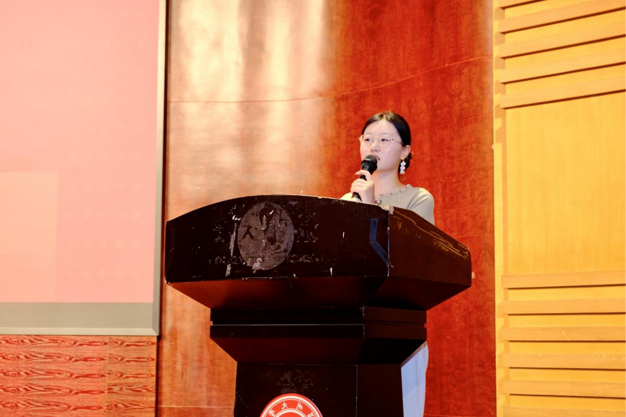 24设计专业林京蓉同学代表研究生新生发言,她分享了自己考研的心路历程,提到要拓宽学术视野、培养批判性思维,擦亮科研探索的初心,勉励新生树立远大志向,在未来的职业生涯中有所作为,为社会贡献自己的力量。