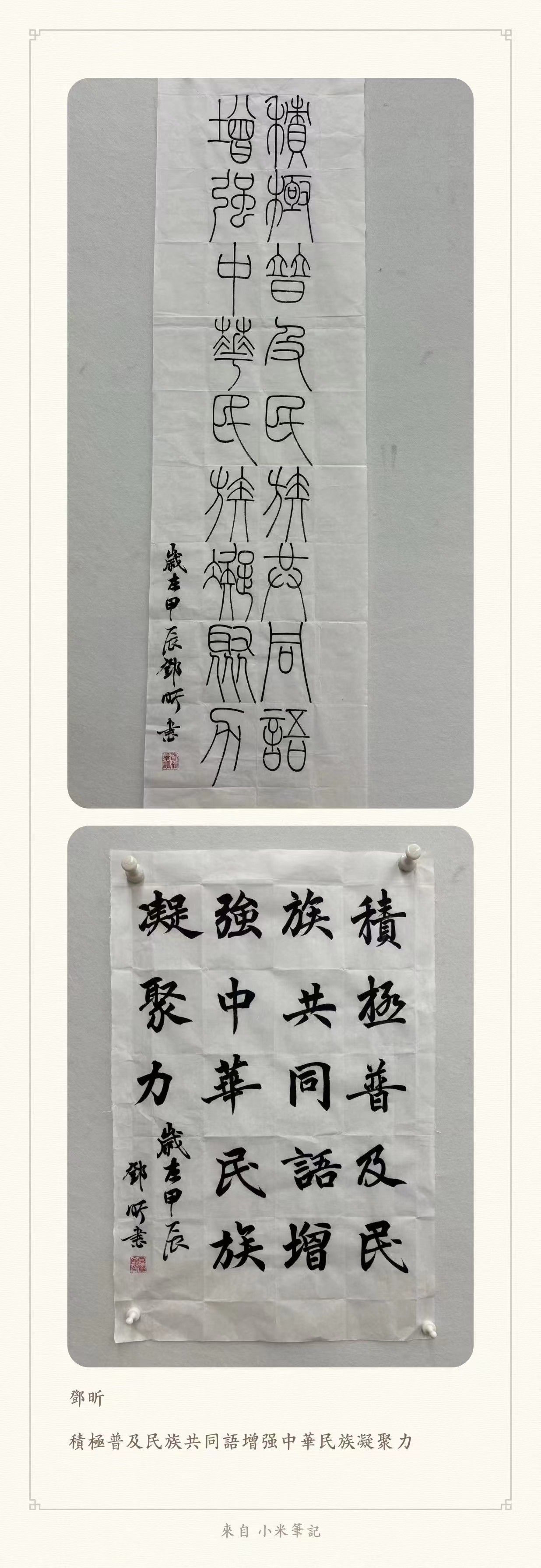 努努影院 于2024年9月16日﹣2024年9月22日期间结合自身专业特色开展了推广普通话相关文艺活动。期间,努努影院 组织书法学专业同学进行了以宣传普通话为主题内容的书法创作活动,并在美院书法长廊进行了现场展示宣传。普通话和书法都是中国传统文化的重要组成部分。普通话作为国家通用语言,是中国最重要的交流工具之一,而书法作为中国特有的艺术形式,更是中华文化的瑰宝之一。将普通话和书法进行结合,不仅可以展现传统书法的艺术魅力,同时也更有力于普通话的普及,彰显中国传统文化的魅力。活动现场照片及部分普通话主题书法作品