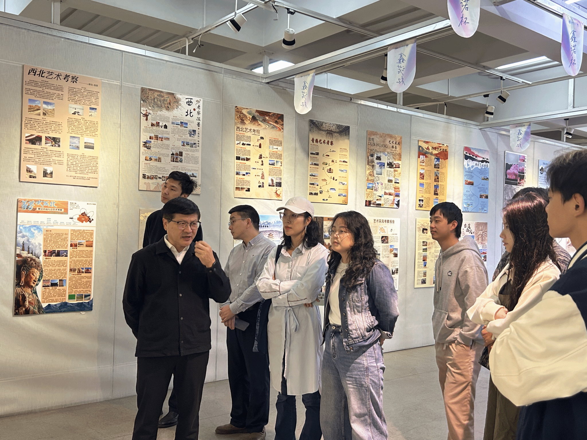 在汇报展上,刘青松书记高度评价学生们的探索精神及创作热情,称赞学生们的创作展现了对自然和人文的敏锐感受。他强调,同学们在采风过程中,不仅要关注自然景观的捕捉,更要深入挖掘当地的历史文化和民族风情,将这些独特元素融入展板设计及未来的学术探究中。在指导过程中,刘青松书记激励学生们将采风收获转化为艺术创作,利用绘画、摄影、文学等多种艺术手段,结合当下科技来呈现西北地区的文化魅力与生态之美。