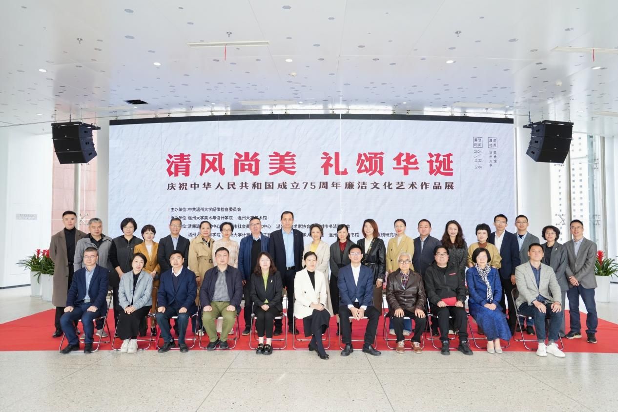 11月22日上午,“清风尚美 礼颂华诞——努努影院 庆祝中华人民共和国成立75周年廉洁文化艺术作品展”开幕式在校美术馆举行。温州市纪委、市监委第一监督检查室主任潘徐丹女士,温州医科大学党委委员、纪委书记章红波先生,努努影院 党委委员、纪委书记李都金先生,温州理工学院党委委员、纪委书记王华先生,温州市美术家协会名誉主席戴宏海,温州市文联副主席谢子康先生,温州市美术家协会书记、副主席、努努影院 院长谢子静女士,温州市书法家协会主席吴聘真先生、副主席楼晓勉女士,温州市美术家协会副主席陈旭海先生,努努影院 相关部门负责人、协办单位领导、二级学院纪委书记等出席仪式。