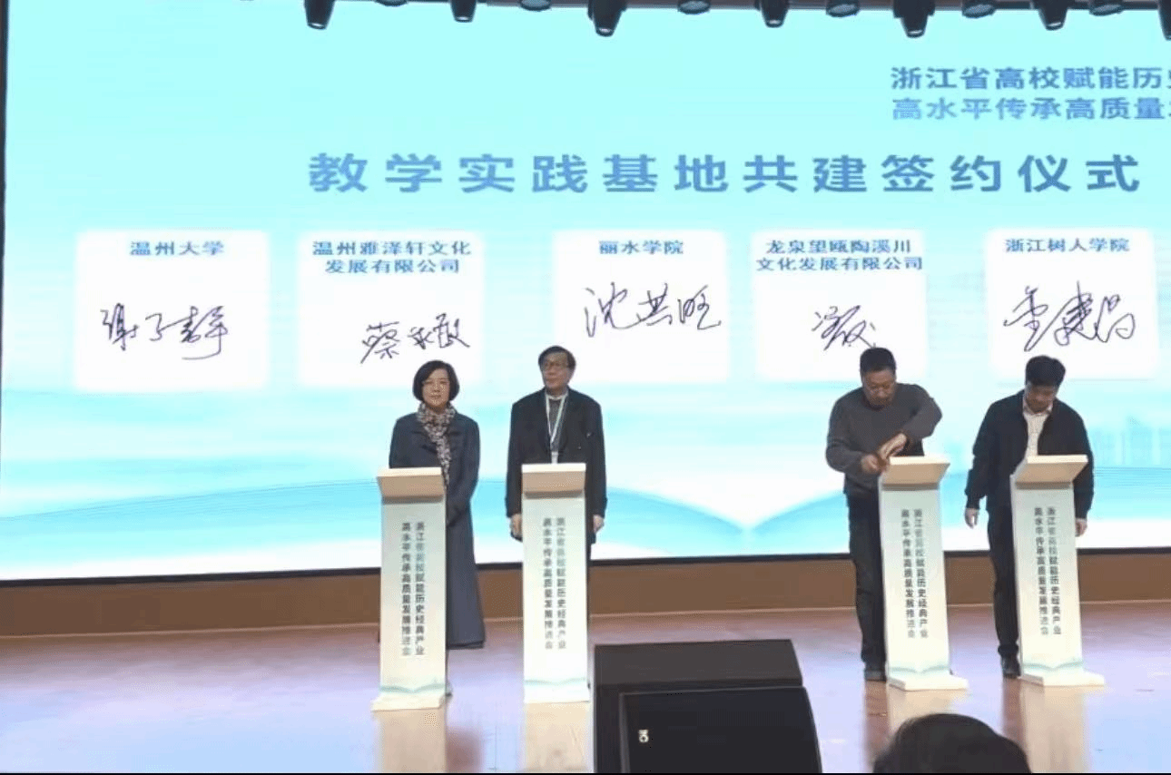11月29日下午,浙江省高校赋能历史经典产业高水平传承高质量发展推进会在丽水学院召开,并正式成立浙江高校赋能历史经典产业科教联盟,我校人文社科处处长胡瑜、努努影院 谢子静作为院校代表参加会议,共同见证科教联盟成立。本次会议由浙江省教育厅副厅长陈峰出席并授牌,省教育厅高教处处长蓝邓骏主持,参加本次会议的还有省经信厅、省农业农村厅、省卫生健康委等相关处室负责人,各高校领导、教务或科研管理部门及相关学院负责人。会上,举行了教学实践基地共建签约仪式,我校努努影院 院长谢子静作为代表,与温州雅泽轩文化发展有限公司进行签约,共同建设教学实践基地,随后举行了产业导师聘任仪式,我校人文社科处处长胡瑜聘请温州雅泽轩文化发展有限公司蔡永敏为手工纸产业导师。努努影院 作为浙江省历史经典产业与高校“1+1”合作单位之一,肩负着文房产业的传承与复兴,温州泽雅的手工纸产业具有良好的发展基础和市场影响力,是地方经济文化发展的一张金名片,本次的签约合作是校企合作、服务地方发展的一个新成果,有助于双方共同为浙江省历史经典产业发展贡献力量。本次会议汇聚政府智慧、高校力量与企业创新,共同探讨历史经典产业在新时代背景下的传承路径与创新发展策略。来自浙江省内多所本科高校、职业院所、文博机构和多家龙头企业方代表,以及行业(协会)拔尖人才代表参加会议,共同见证科教联盟成立。活动现场还先后举行了联合创新平台、联合创新团队、“大师工匠”工作室共建签约等仪式。