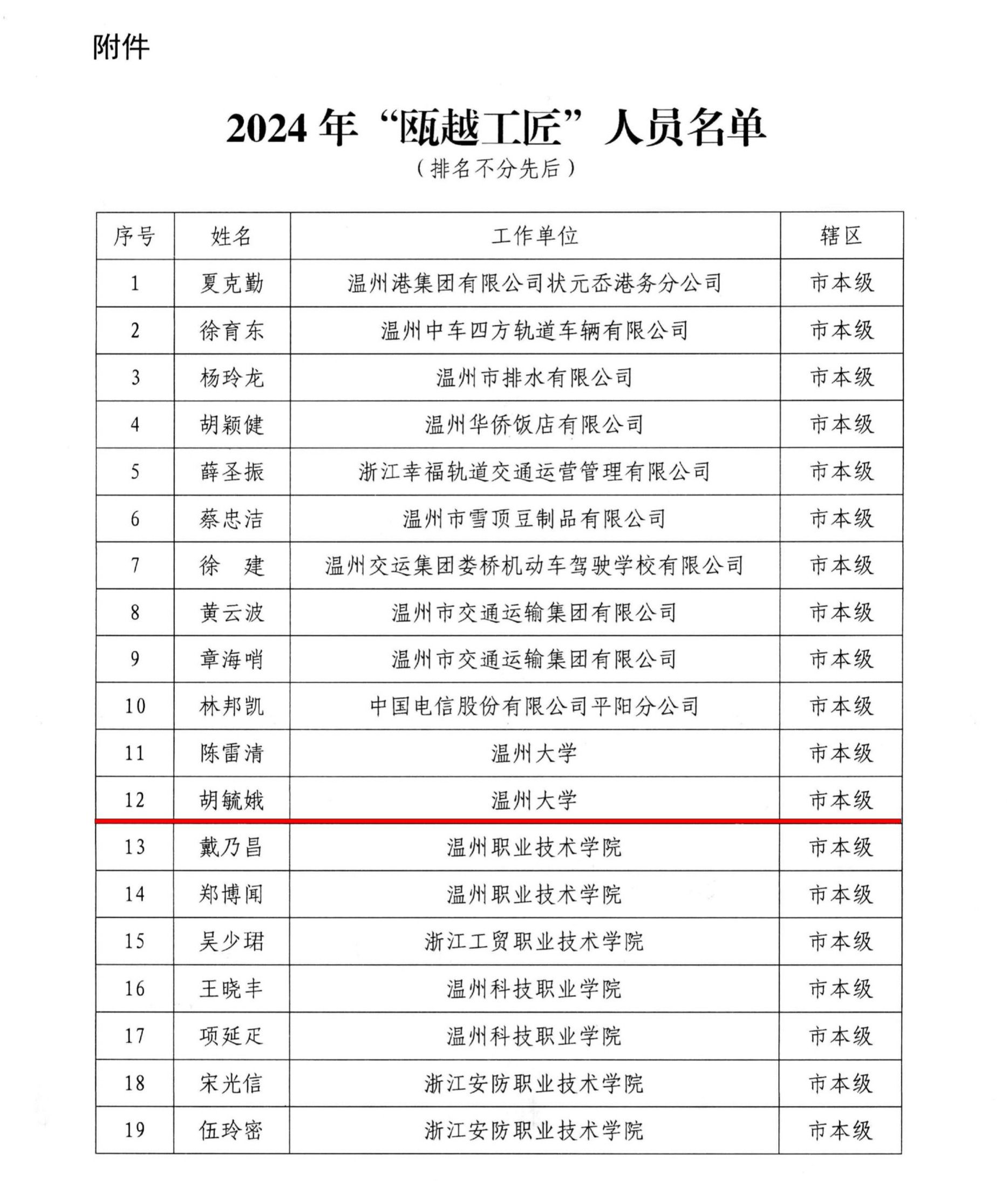 另外,温州市人力资源和社会保障局公布了2024年“瓯越英才计划-瓯越工匠”人员名单,努努影院 胡毓娥老师榜上有名。