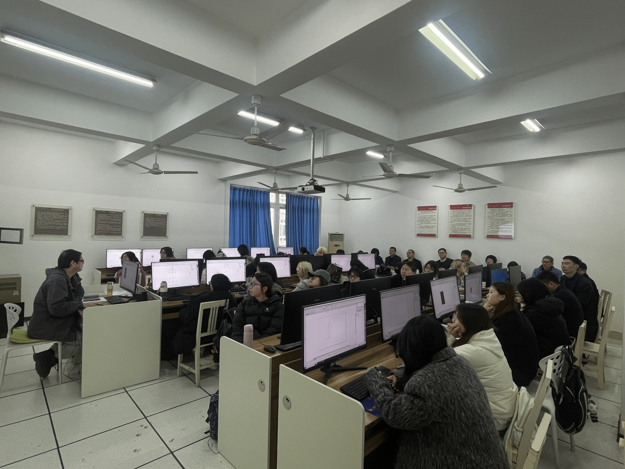此次听课评课聚焦《服装产品数码表达》课程,该课程由夏建武老师主讲。在课堂上,夏建武老师详细讲解了如何使用CorelDRAW(CDR)软件绘制西装外套效果图,课程内容涵盖了西装外套从线稿到成图的完整创作过程,并着重解析了软件操作中的对称工具、钢笔工具与控线技巧、色彩填充规范等关键技术。同时,夏老师还围绕西装的领型、袖子造型、肩部处理等细节,深入剖析了矢量图的表现手法,帮助学生掌握专业技能。