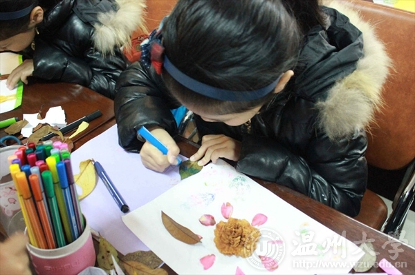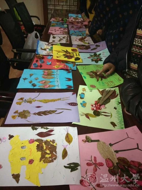 2017年3月18日,温大努努影院 "艺家人"青年志愿者协会成员和志愿者们共同前往梅泉社区文化礼堂,进行了以“有趣的叶子”为主题的手工DIY活动。 活动在欢声笑语中拉开序幕,小组代表周岚茜同学以一组树叶画引入今天的主题,倡导小朋友们走进大自然收集各种各样的树叶,细心观察,并对所收集的树叶进行初步了解;接着引导小朋友们观察自己的树叶,并和其他小朋友交流,讨论出更好的制作方法。每个小朋友都有不同的想法:“我想制作一个皮卡丘,我想制作一个长胡须的猫咪,我想制作一个海底世界”。在志愿者们的引导下,小朋友们根据自己的想象,用粘、剪、画相结合的方法,巧用树叶制作出各种图形的“树叶画”,有的小朋友用蜡笔先画图后用叶子进行装饰,有的直接将叶子剪出自己所想要的形状,多种不同方法的运用使整幅画面生动起来。在活动期间,志愿者们各司其职,充满热情。 此次支教活动的目的是为了培养小朋友们从小热爱大自然的感情,锻炼他们学会观察,善于发现,动手动脑的能力,在玩耍中学会欣赏并感受春天的美丽,激发热爱自然,热爱生活的情感。通过指导小朋友们掌握树叶贴画的制作方法、技巧,利用落叶进行美的再创作,开发他们丰富的想象与创造力,培养其发现美,创造美的能力,并养成小朋友们团结协助的精神品质,感受到参与活动的乐趣和成功的喜悦,并学会大胆地表达自己的感受。文:王 伟 图:朱灵睿