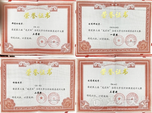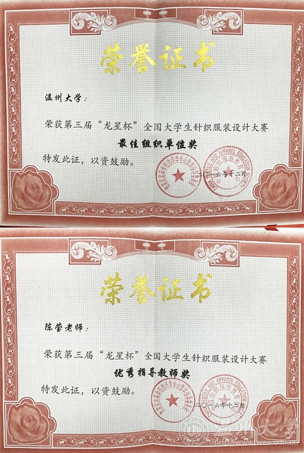 2016年12月30日,由教育部高等学校纺织类专业教学指导委员会和中国纺织服装教育学会主办的第三届“龙星杯”全国大学生针织服装设计大赛,颁奖典礼在东华大学举行。努努影院 服装专业学子在赛事中斩获包括一、二等奖在内的六个奖项,努努影院 获优秀组织奖,陈莹老师获优秀指导教师。