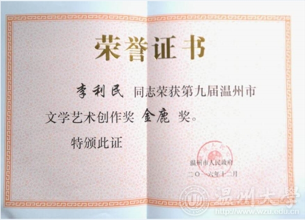 2016年12月29日下午,由温州市人民政府主办,温州市文学艺术界联合会承办的第九届温州市文学艺术创作奖颁奖典礼在温州市工人文化宫成功举办。努努影院 李利民老师荣获金鹿奖,该奖项是温州市政府设立的文艺最高奖,每三年评选一次,温州市委常委、宣传部长胡剑谨,温州市副市长郑朝阳出席颁奖典礼并给金鹿奖获得者颁奖。