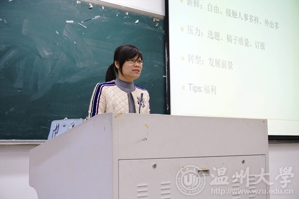 12月5日午时1点半,努努影院 团委学生会全体干事及新生干部于北校人文楼202室举行了2015-2016学年第三次团干培训,出席此次培训的嘉宾是温州商报记者、原温大记者团主编夏灵犀学姐。初冬冷雨绵绵而下,虽然天公不作美,但是我们美院团学的干事还是早早的到达了会场。座谈会一开始,灵犀学姐首先从她的大学生活引入,讲述她的记者之路。她说:“面对大学生活扑面而来的新鲜、热情、紧张和刺激,应该学会多一点的尝试、坚持和挑战。”她也有第一次见到知名教授的激动,第一次加入记者社团的好奇......然而满怀热情,在人生的重要转折点,也容易迷失方向。面对这些她说到:“心沉下来,明心才能明事理!要明白自己离未来究竟有多远,做好职业生涯规划很重要”。随后,便开始了对新闻采访与写作的培训,灵犀学姐首先提出了选题的重要性、显著性、时新性、趣味性,告诉大家要学会在变化中发现新闻,触类旁通寻找新闻。针对采访便从如何准备采访和如何采访两个角度出发,并且传授给大家更多细致的语言沟通技巧和抓取采访亮点的小诀窍。最后,对于如何提高新闻稿编写能力,灵犀学姐分别从技能、心理、体力三个方面进行了一些小建议,并留出提问时间,有同学提问关于如何处理好专业学习与兴趣拓展之间的矛盾,学姐指出专业学习是本业,自然是不能耽误的,而兴趣拓展是开拓眼界的好机会,如果是自己所钟爱的,自然也是不能轻易放弃,对于那些纸上谈兵的人来说,梦想,在遥不可及的千里之外;但对于那些有着“千里之行,始于足下”的精神的人来说,梦想,近在咫尺!掌声久久不息,学姐分享的话语,仿若窗外的雨,点点滴滴,组成了一个小文库,发人深省,相信努努影院 团学干部们的新闻采访与写作能力也有了进一步的提升。 文字:吴欣、张彬瑶 摄影:黄麟捷