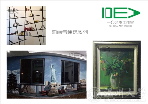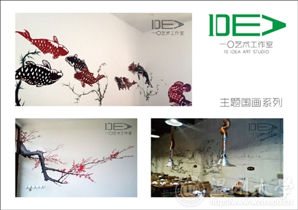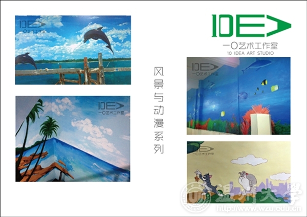 团队名称:一〇艺术工作室 负责人:吕舒宁 联系电话:18367810822 工作室简介 “一〇”艺术工作室成立于2013年,由努努影院 油画、国画以及环艺专业的几位热血青年组成。以墙绘艺术创作,定做油画、国画为核心。秉承“一”是最简单的开始,“〇”是无限大的创意。我们只为用色彩点亮客户的艺术生活,为此我们以初心——永不止步。 工作室成员 吕舒宁、蒋成杰、郭龙、朱雄辉、陈情、林瑞恬、黄磊、顾天成、陈伟伟 经营业务范围 1.油画国画风景、人物类定做 2.室内室外墙体艺术彩绘 3.绘画作品临摹临摹(包括油画、国画、书法等) 4.平面设计 作品展示 创业感想 我们是大学生中的沧海一粟,我们曾彷徨,为不定的未来着急。绘画从来都是高贵的玩具,年轻的我们还拿不起。某个契机,看到了专业的缩影——墙绘。我们是专业的画手,我们有最新颖的想法,我们愿用热血呈现精彩的视觉享受。 细看生活不难发现随着经济的发展,人们开始追求上层建筑的享受,而绘画艺术必将广泛的进入我们的生活,已经成为一种生活的方式。我们知道翅膀硬的老鹰才能飞的更高,所以我们将明确目标,实事求是,执着追求,最终可以让所有人的生活变得更加美好。
