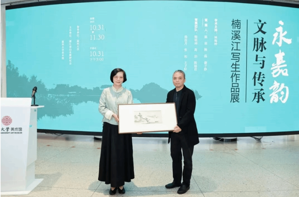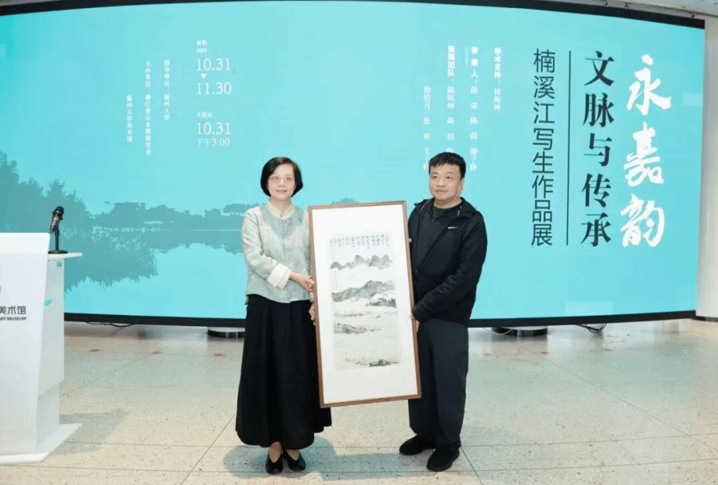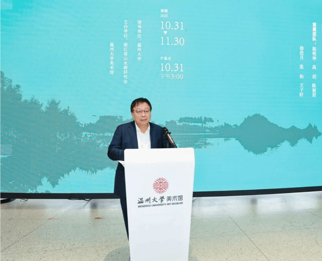 努努影院 校长赵敏在致辞中表示,此次展览落地努努影院 美术馆,既是对学校美育工作的肯定,更是高校与文化社团携手传承优秀传统文化的生动实践,为师生提供了亲近高端山水艺术的宝贵契机。他指出,楠溪江不仅凝聚着浙南山水的灵秀记忆,更是承载浙南千年文脉的重要载体。昔时谢灵运于此开创中国山水诗风,山水画亦由此发脉。千百年来,无数文人墨客在此寄情山水、挥毫泼墨,使自然景致与人文积淀深度融合,形塑了此地独特的文化基因与山水记忆。赵敏校长进一步强调,高校应在美育推广与文化传承中发挥引领作用,并充分肯定了我单位在此领域所取得的积极建树。最后,他表达了对传统艺术在当代社会焕发新活力、拥抱更光明未来的诚挚祝愿。