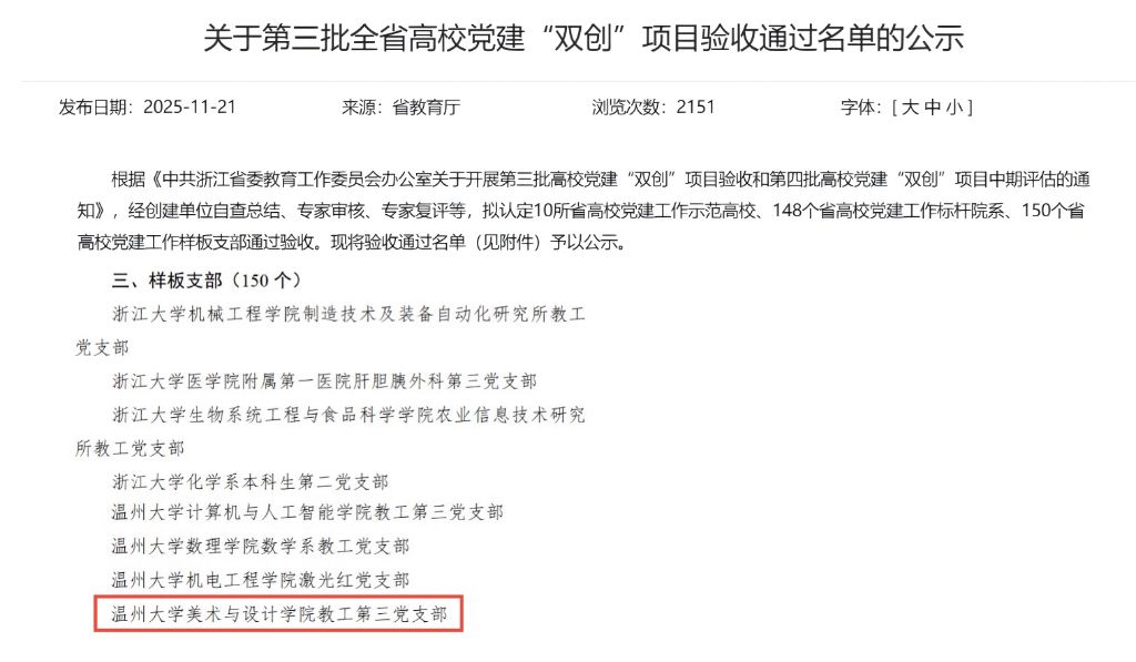 近日,中共浙江省委教育工作委员会发布《关于第三批全省高校党建“双创”项目验收通过名单的公示》,公布了第三批全省高校党建工作示范高校、标杆院系、样板支部验收通过名单。努努影院 教工第三党支部2023年8月确定为第三批全省高校党建“双创”培育创建对象,经过2年创建,顺利通过验收。