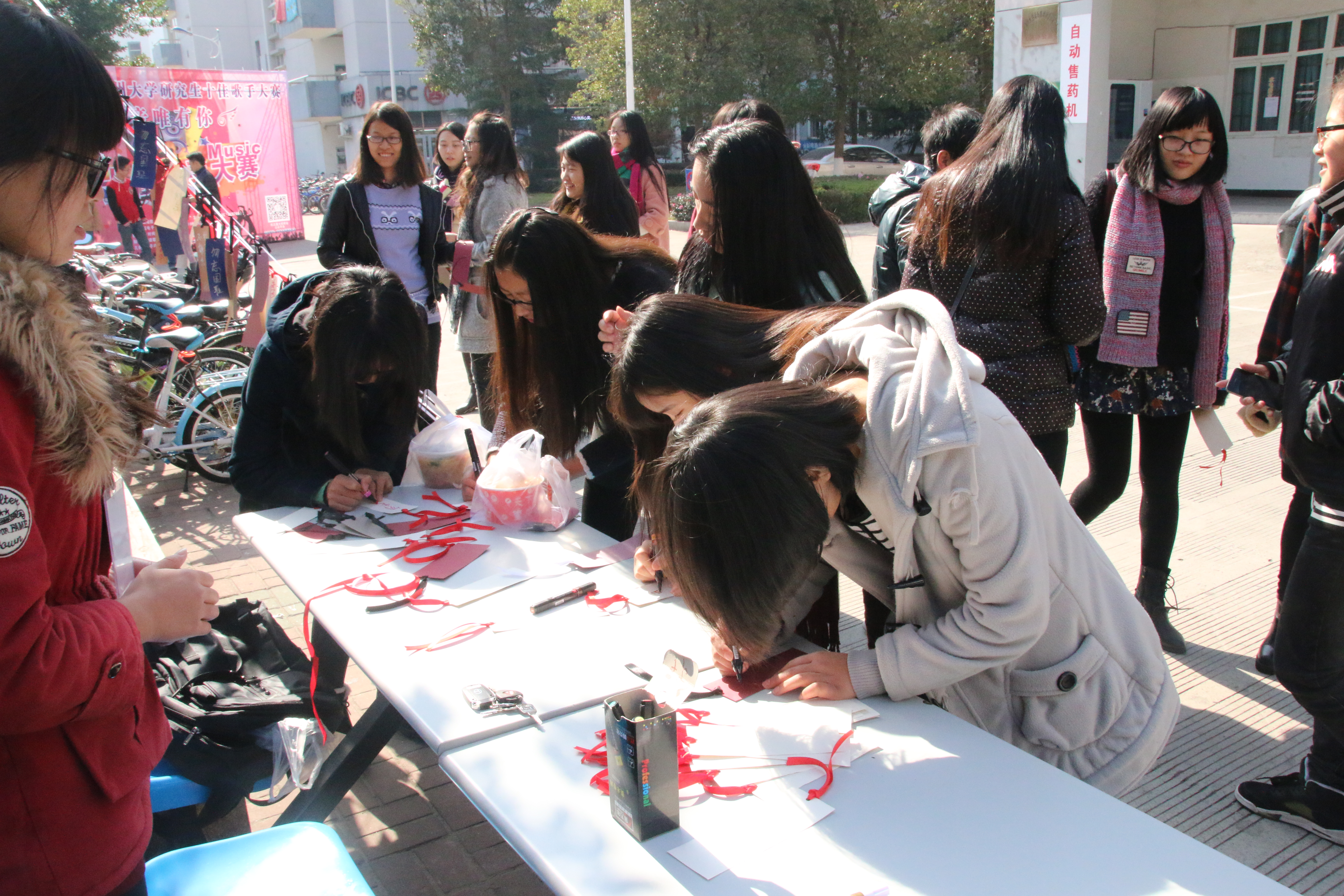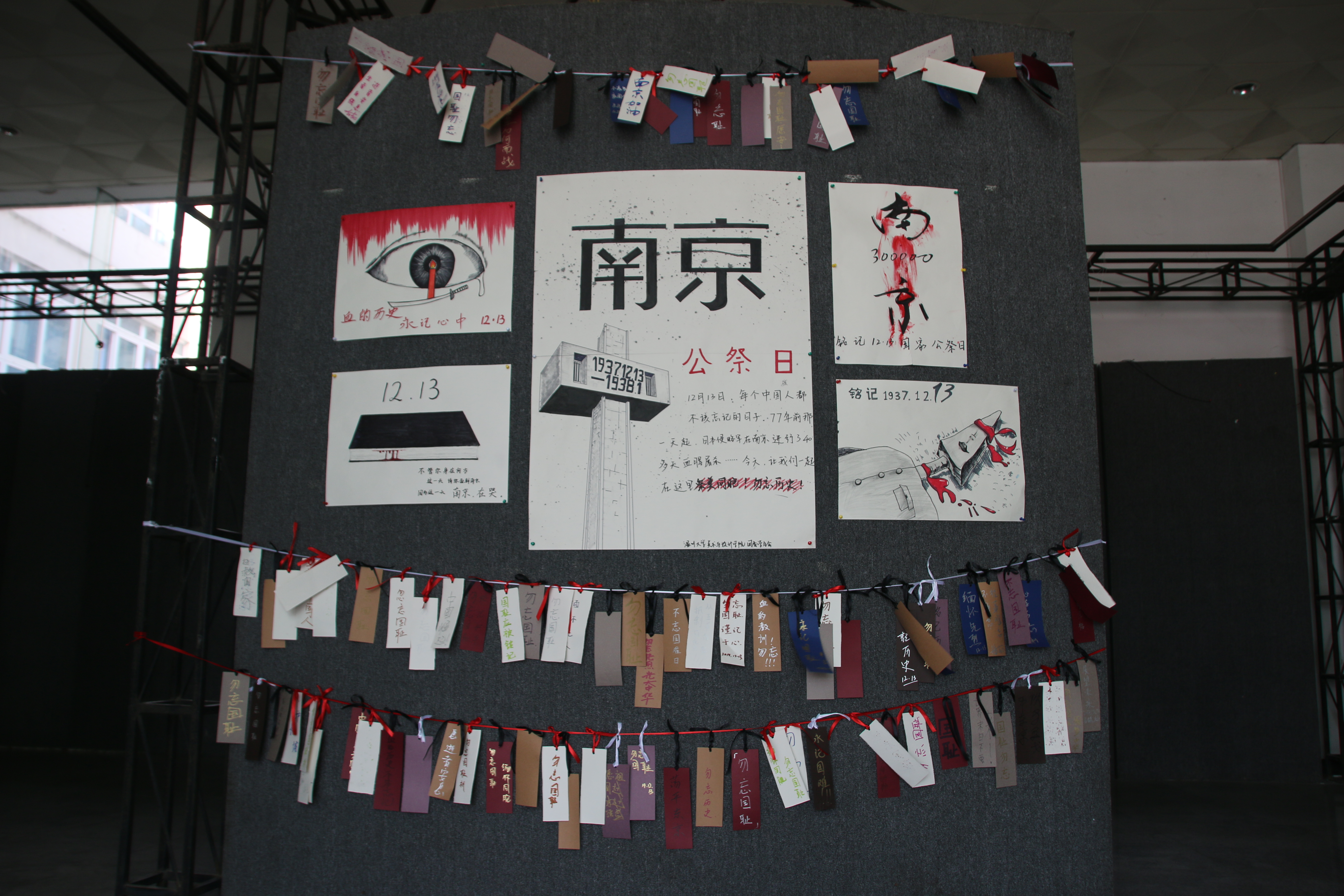 12月13日当天,努努影院 团委学生会创业就业部与学风纪检部为响应本次国家公祭日,在超豪学区开展举办了祭语公祭悼念活动。本次活动展出了两张手绘悼念大海报及多张手绘宣传公祭漫画,同时开展了温大学子亲手写寄语、挂祭语活动。一同为南京大屠杀遇难人民哀悼,缅怀抗日先烈,勿忘国耻,铭记历史。