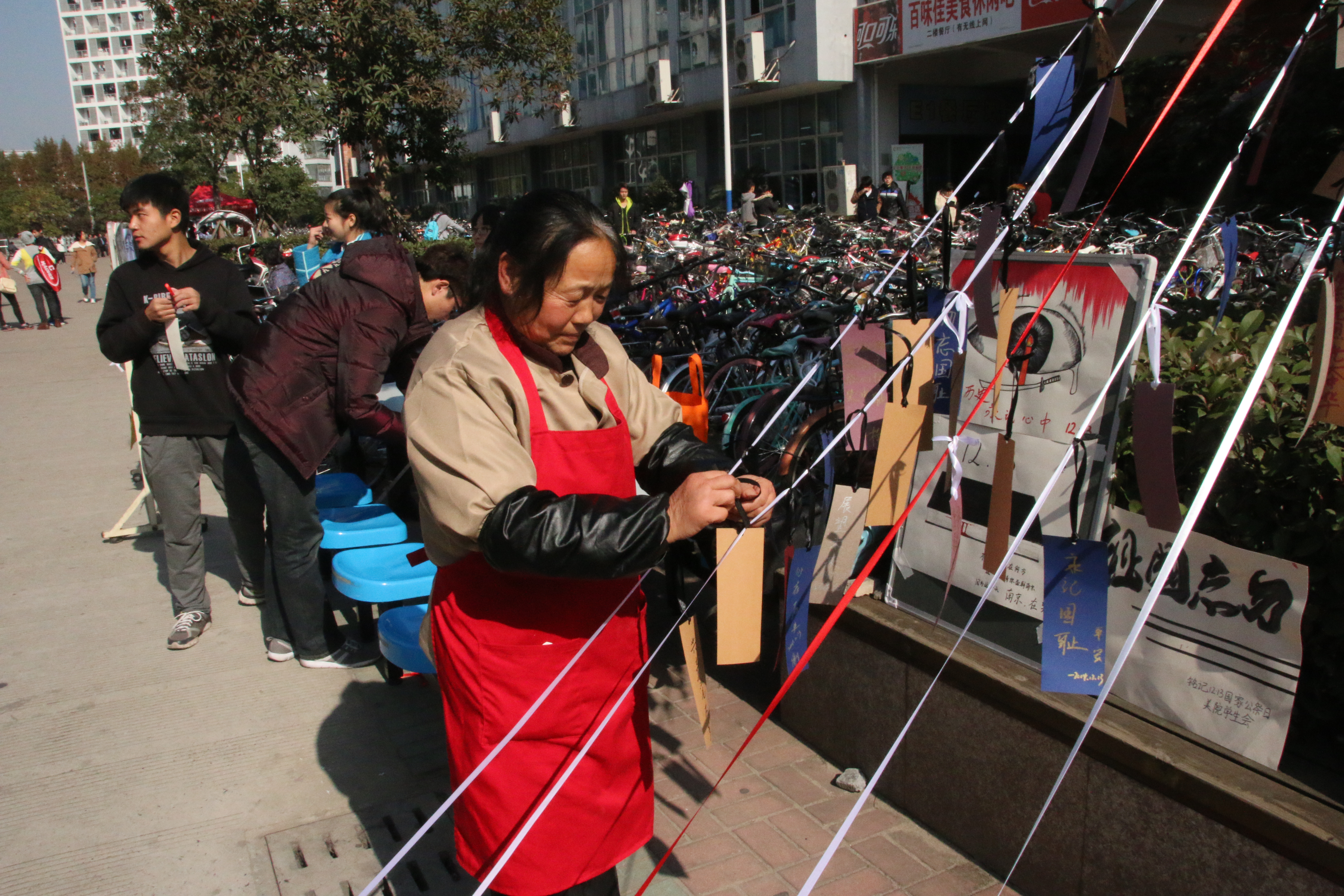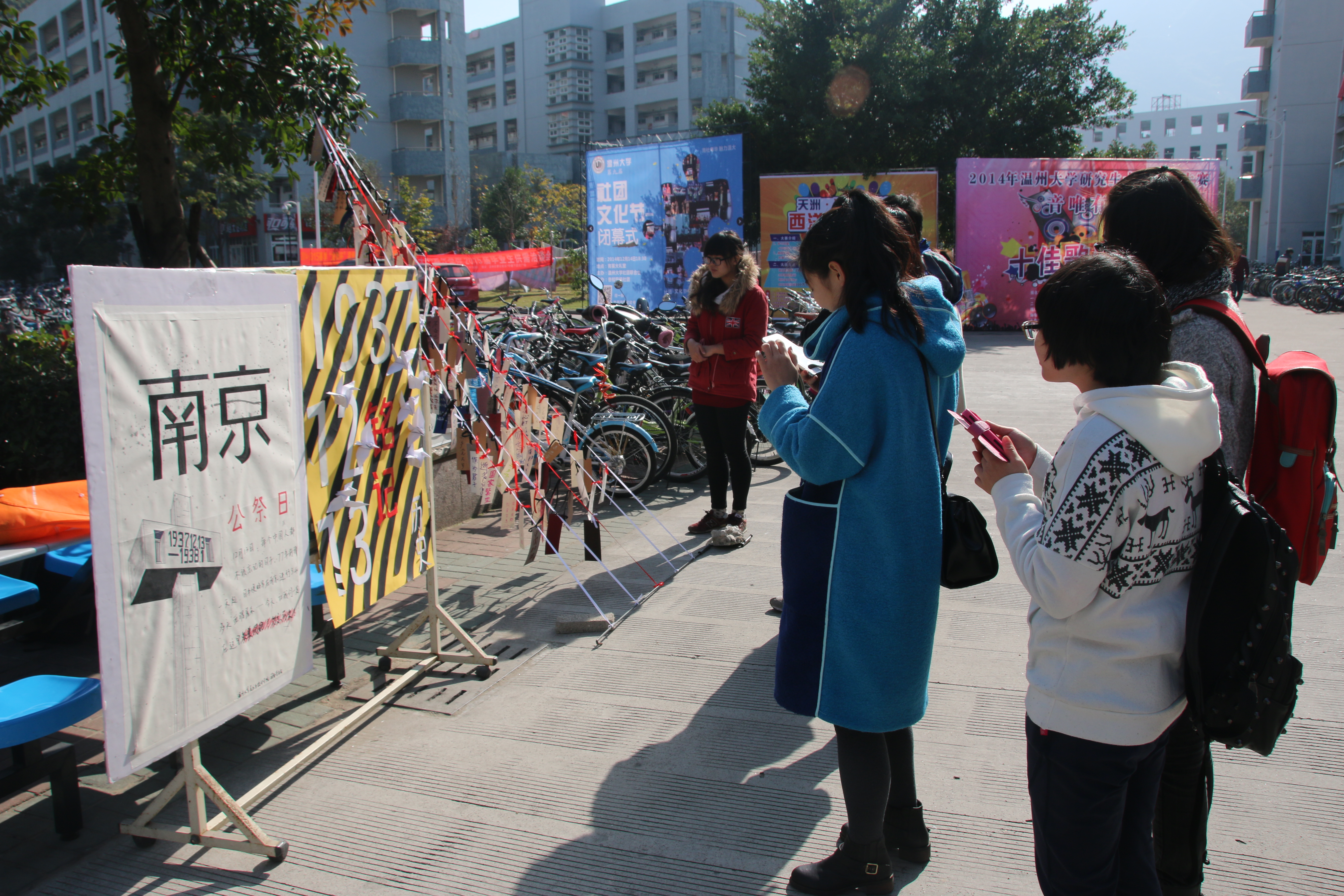 12月13日当天,努努影院 团委学生会创业就业部与学风纪检部为响应本次国家公祭日,在超豪学区开展举办了祭语公祭悼念活动。本次活动展出了两张手绘悼念大海报及多张手绘宣传公祭漫画,同时开展了温大学子亲手写寄语、挂祭语活动。一同为南京大屠杀遇难人民哀悼,缅怀抗日先烈,勿忘国耻,铭记历史。 记住历史,但不要记住仇恨; 可以原谅,但绝不可以遗忘; 让白骨可以入睡,让冤魂能够安眠 把屠刀化铸警钟,把逝名刻作史鉴; 让孩童不再惊恐,让母亲不再凄叹 让战争远离人类,让和平洒满人间; 让我们以国家的名义,祭奠死难同胞! (通讯员:沈宇烽,摄影:张昇)