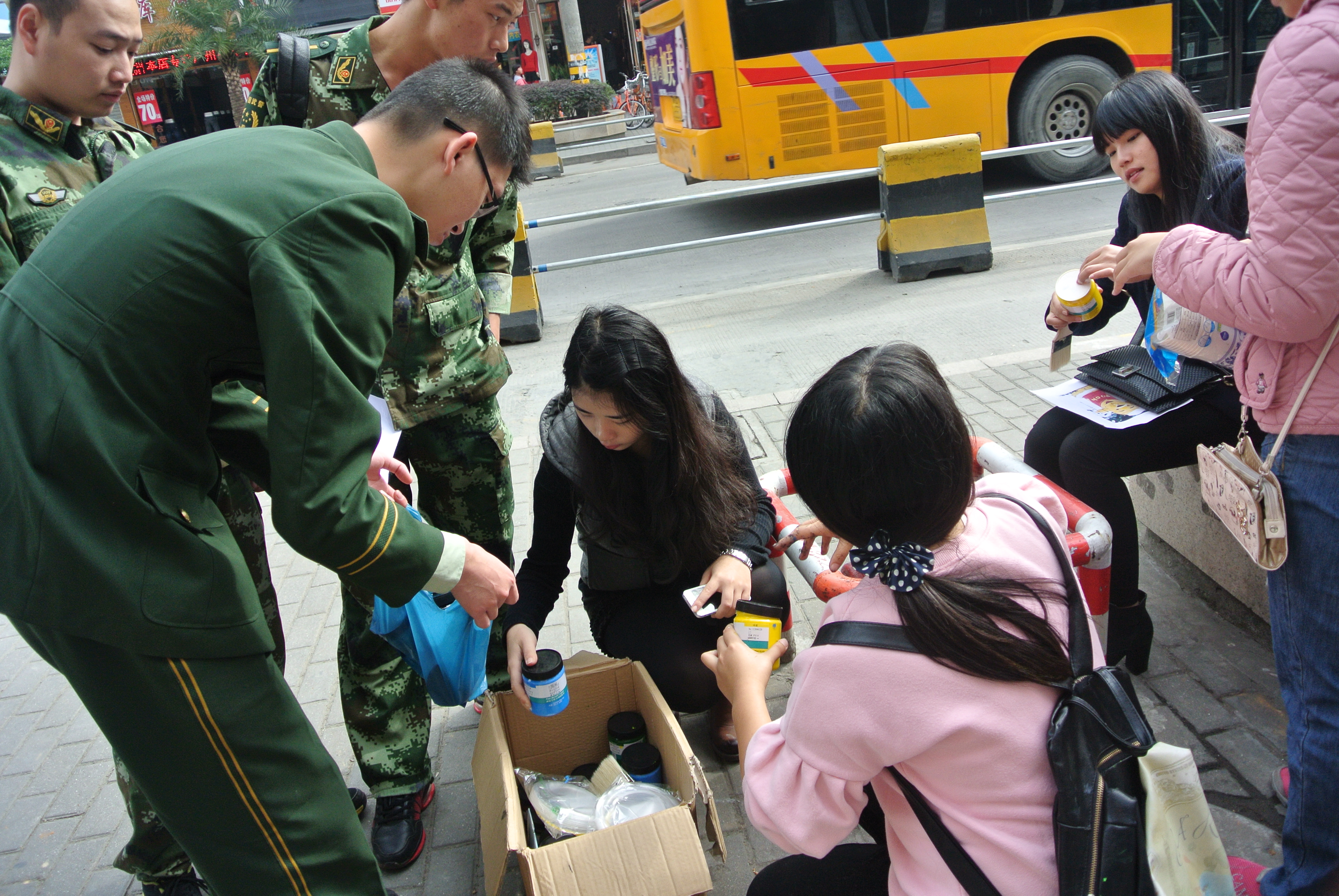 上午九点,在消防官兵们的带领下,志愿者们来到了新桥街道,因为人数有限,每一个志愿者都要负责一个消防栓,志愿者们根据街道上消防栓的特点很快选出了适合的图案,便向自己的“战场”奔去。
