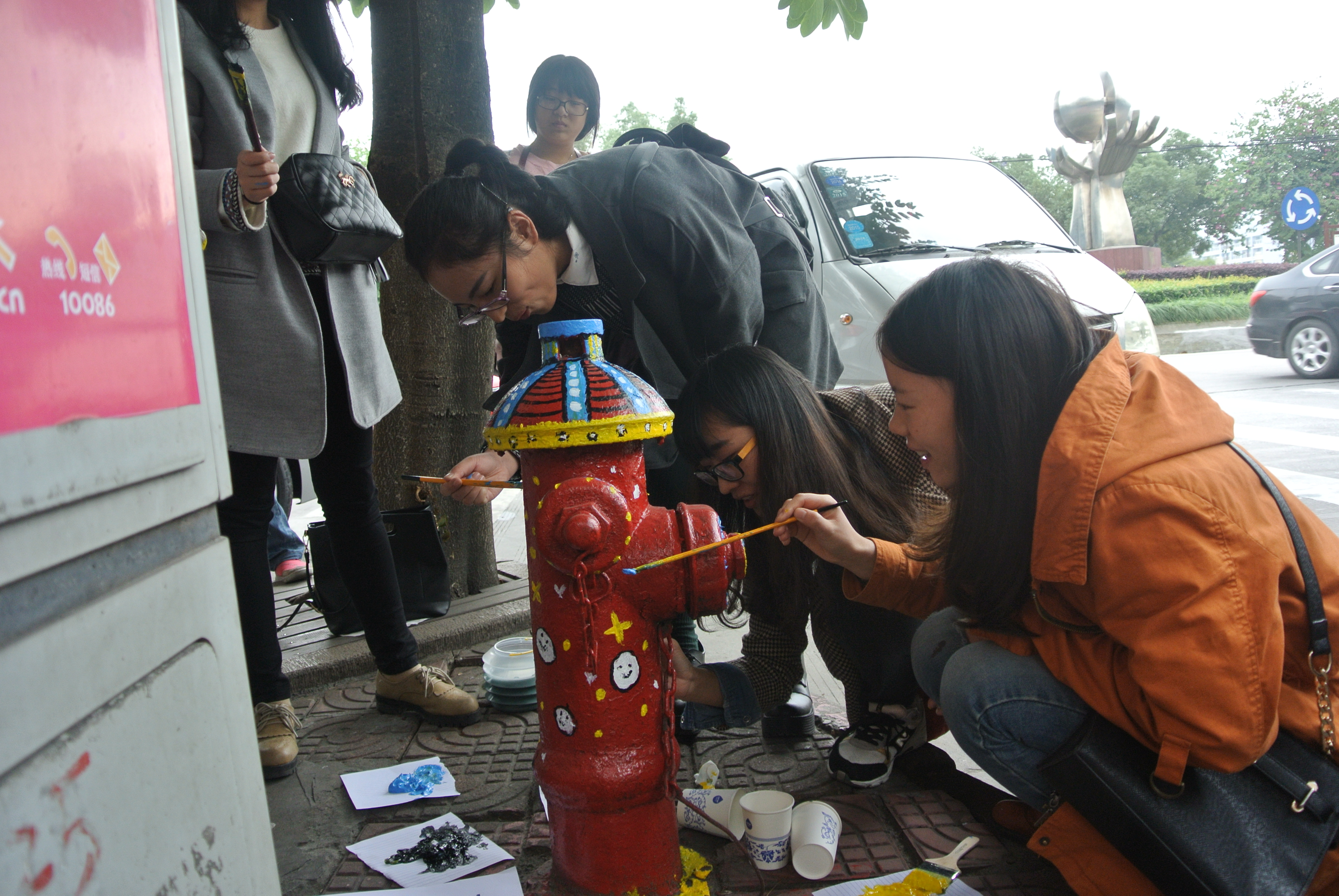 经过两个小时奋力备战,十个消防栓已经全部焕然一新了,志愿者们运用自己扎实的专业技能在限定的时间内保质保量地完成了任务,一些提前画好的志愿者去帮助还没有画好的志愿者,大家合作完成,充分展现了温大青年志愿者团队的团结互助精神。