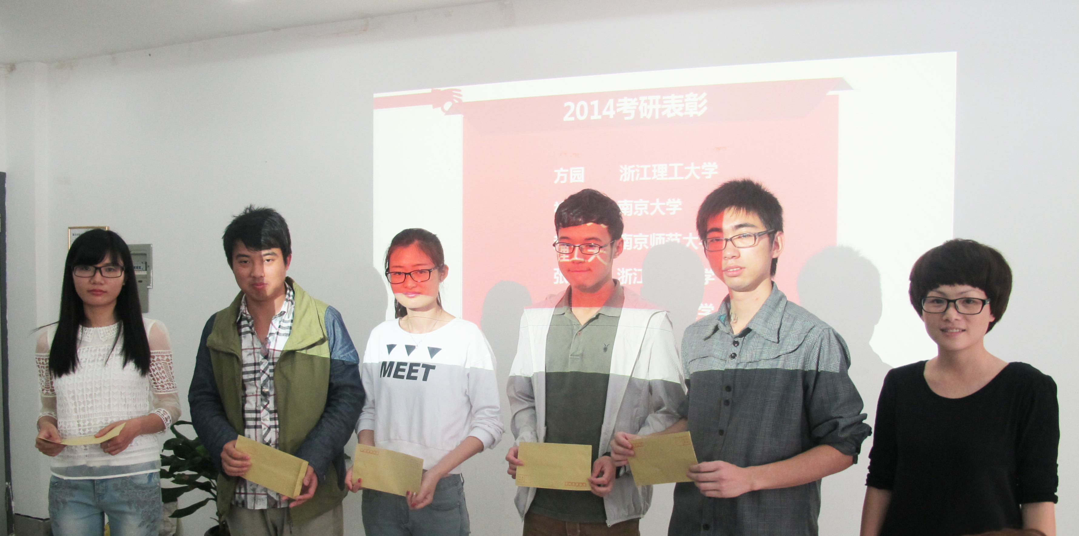 叶老师首先对努努影院 2014年国内考研成功录取的美本师范班褚明敏、服装设计与工程班方圆、环境艺术设计班赵锦程、美本班张伟佳、服装设计班邬仁亚,和国外考研成功录取的环境艺术设计班袁炜楠、平面设计班李奕璠、鞋靴设计班魏子八位同学进行了表彰仪式,并颁发了学院奖金。叶老师讲到,考研经验交流会让在座的每位同学能够真切、直观、详实地体会考研路上的辛苦与喜悦,相信在知识道路上坚持的同学们都会收获更好的自己!