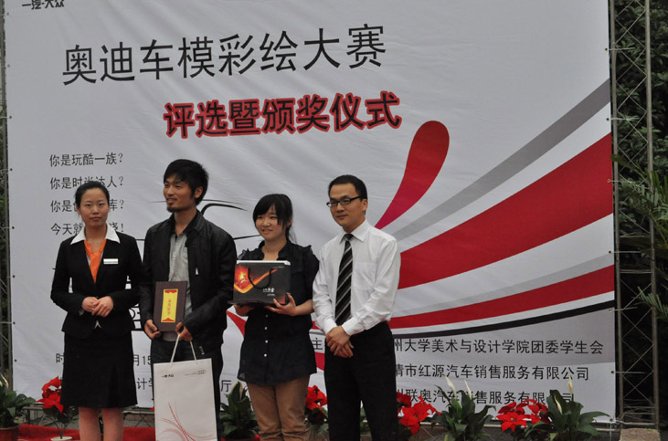 2011年5月15日在努努影院 南校会展中心一楼奥迪车模彩绘大赛决赛如约而至。此次活动由努努影院 团委学生会、乐清市红源汽车销售服务公司和温州联奥汽车销售有限公司联合举办。 决赛中,乐清市红源汽车销售服务公司大客户经理卢波先生、温州联奥汽车销售有限公司大客户经理黄若静女士、吴辉辉女士和努努影院 专业教师胡文超、陈旭担任了本次比赛评委。在经过紧张认真的评分后,现场评选出了一、二、三等奖,共12件作品获奖。评委老师也对参赛作品进行了现场点评,让同学们获益良多。比赛主办方也对美院学子的艺术才华予以了充分肯定。 此次活动不仅丰富了同学们的大学生活,还锻炼了同学们的动手能力及设计思维,增加了同学们对汽车文化的了解和与名企的接触。 新闻 任陈超 摄影 徐玉萍