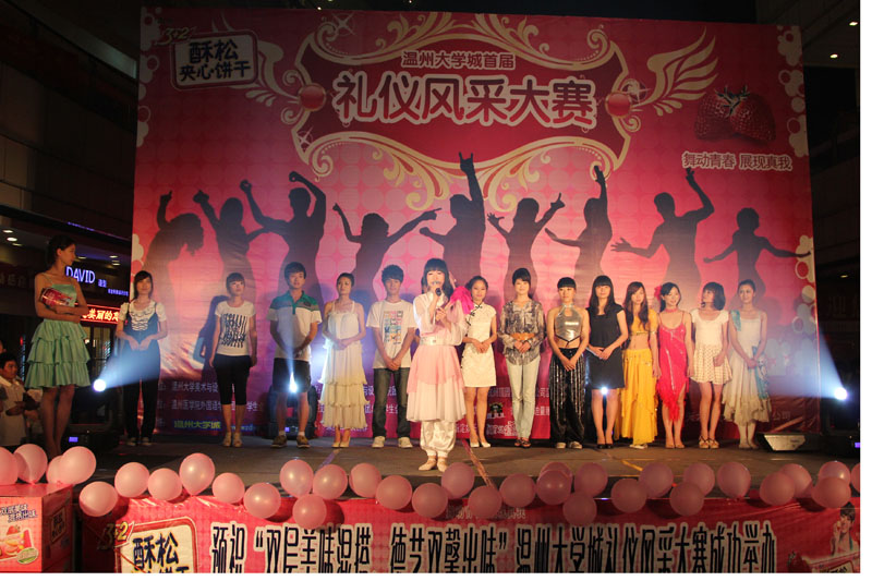 2011年5月7日晚上6点半,在高教园区商务中心举办努努影院 第一届礼仪风采大赛人气赛,本次大赛由努努影院 主办,康师傅3+2苏打夹心饼干、果麦等赞助。在往来人流中现场搭起的舞台吸引广大路人前来观看,并期待选手们的精彩亮相。 经过层层选拔、脱颖而出的16位温大选手,赛前都做了精心的准备,期望在这美好的夜晚给到场的观众带来非凡的视觉享受。选手们各展才华,唱歌、跳舞、茶道、朗诵等等精彩才艺,将各自的风采施展得淋漓尽致,表演在阵阵掌声中华美谢幕。尤其是来自美院的10号王松丽选手,一场Design的创意演绎,大家在惊叹其设计魅力之余,早已沉浸在她那双巧手所呈现的华丽变身,欢呼声将此刻激情点燃。 在这场才情洋溢的舞台上,现场游戏互动穿插进行,有奖竞答吸引在场观众们踊跃参加,为这紧张的赛场带来轻松愉悦的气息,欢声笑语将热情流露。细心的赞助商们在比赛之间,为观众们免费呈上茶水果冻及饼干。 现场随机挑选的观众评委根据选手的才艺展示以及终极拉票,为自己心仪的选手投上宝贵的一票。众望所归,人气王花落10号选手王松丽,我们期待她在决赛中更精彩的演出。 两个多小时的比赛,露天的舞台,来往的人群,在闪耀的灯光中,我们将视线聚焦在耀眼的选手身上。在现场,我们能更直观地测试选手的人气指数,让更多的人关注温大第一届礼仪风采大赛,关注温大选手们的别样风采。在此,我们衷心希望接下去的决赛圆满举行,寻找出我们心中的终极礼仪风采之星。 作者:张茅惠 摄影:高建文