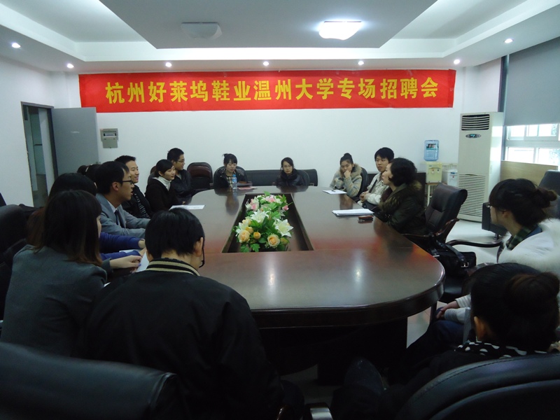 2010年11月30日下午1点半,努努影院 2B216会议室举办了杭州好莱坞鞋业努努影院 专场招聘会。杭州好莱坞鞋业有限公司总经理成雯亲自前来任面试官,努努影院 07级鞋靴设计班的同学们积极应聘。 成雯总经理一开始就询问在座的各位同学,包括为什么当初选择绘画、文化功底如何等等。谈话中,作为校友的她向同学们讲起她过去的大学时光,表示大学生多学点东西总是好的。为了能了解在座的每位同学,成雯总经理让同学们轮流进行自我介绍,说明近几年的工作目标。期间,她向同学们了解起专业方面的能力。 经过一轮简单介绍,6位同学脱颖而出,按地域被平均分成3组,每两人一组依次单独面谈。成经理考察了同学们的专业能力水平,吃苦耐劳的品质及设计方向等多方面。希望公司能在此次招聘会中相中千里马,培养出属于自己品牌的中国化的设计师,打造世界级品牌,并真诚鼓励同学们努力,实现自己的目标。 在这接近两个小时的招聘会中,同学们畅所欲言,递交精心准备的个人简历,希望能被好莱坞公司所青睐,让自己学有所用,一展抱负。最终的应聘结果不日即将揭晓,敬请期待喜讯。