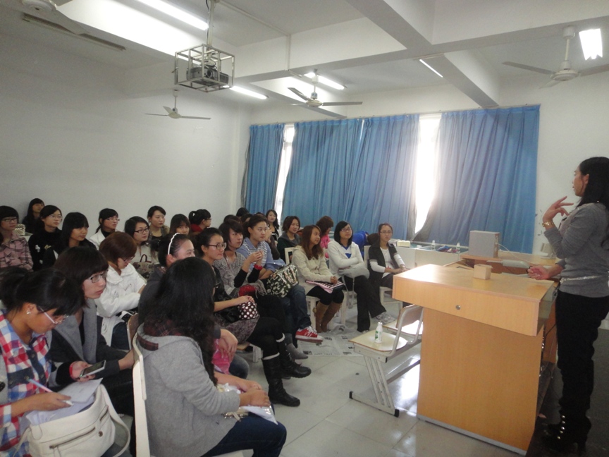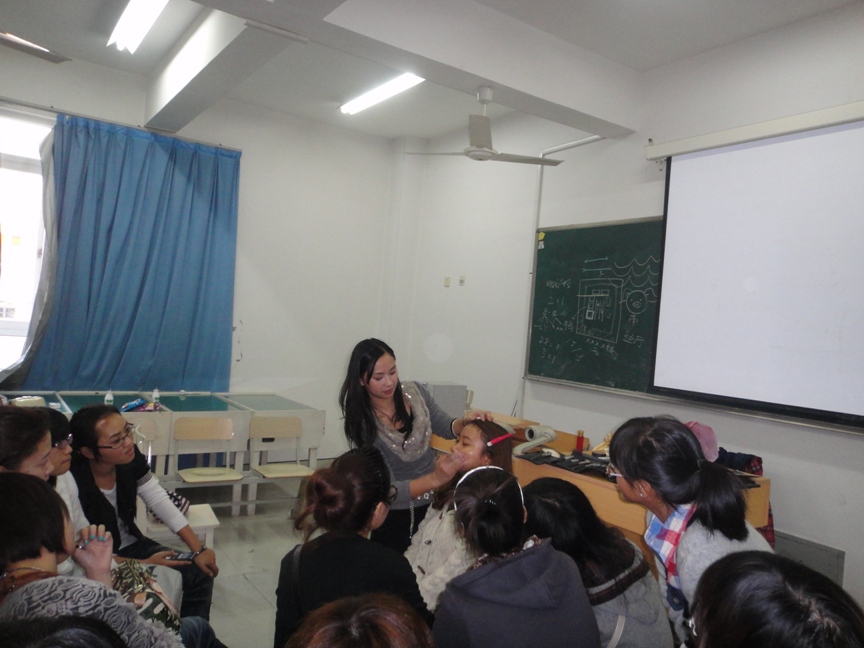 2010年11月20日星期六14:00~16:00,在美院2B3001,雪思美容院院长、医学院WinGirl俱乐部指导老师朱来顺,为努努影院 的化妆培训素质拓展班画上一个完美的句号。 此次培训是朱老师在本学期第四次给大家辅导。其热烈的掌声,阐释着大家对本次培训的渴求和对朱来顺老师的喜爱。朱老师说,化妆是艺术。她要求人们在化妆之前先了解自己今天穿了怎样的服装,代表着怎样的形象以及自己的性格;希望每个人能了解自己面部的优点和缺点各是什么。然后,她让同学来当模特,一步一步地教同学们怎么样打底、修眉、调肤色、画眼线、眼影、腮红和唇彩。而同学们也是热情高涨,积极提问,踊跃参与其中。在示范的过程中,她也再三强调该注意的地方。比如定妆时要用散粉,补妆时要用粉饼,刷子半年洗一次,而在平时,只要用散粉洗就可以了……示范结束后,她则让同学们自己亲手实践。 这次培训,不仅让爱美的女生体验到了化妆带给她们在外表上的飞跃,更是让她们学习到了化妆的真正技巧。