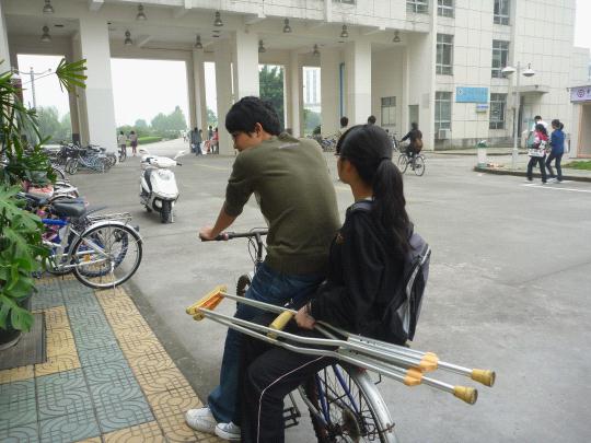 2010年10月14日早上6点30分,努努影院 第三党支部的预备党员吴志斌已经早早地来到A区一号楼楼下,等待接送因脚受伤的10届新生仇芝露同学上下课,这是他第二次接送芝露同学了,而第三党支部的“爱心接力”活动也已经有半个多月了。