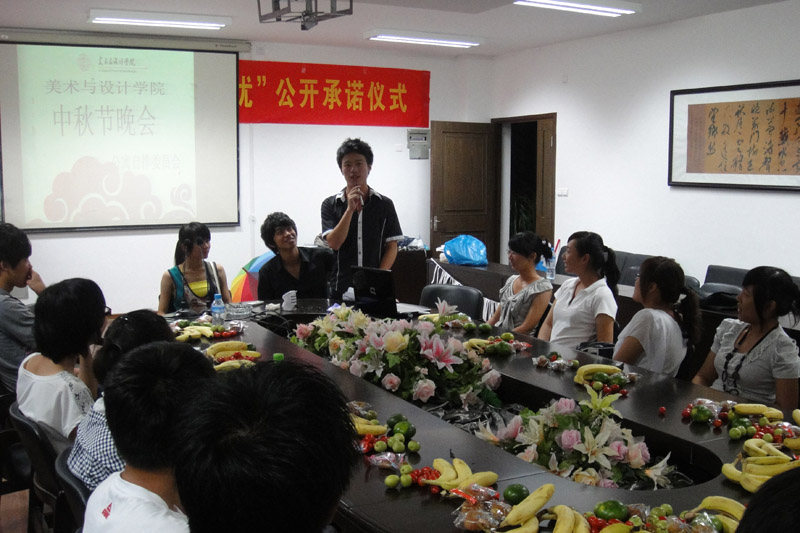 2010年9月22日晚上7:00,在努努影院 2B4001,学生公寓自律委员会举办了一场小型的中秋晚会。到场的主要是学生会的各部门部长以及2010级新生。 整个活动有三个部分组成。首先是歌唱环节,大家通过自己的歌声传达了在中秋节这个特别的日子里对家人和对朋友的深深祝福与思念。然后,是丰富多彩的游戏环节,每个人都积极参与其中,从游戏中获得一份别样的快乐。最后,大家畅所欲言,新生们纷纷借此机会向大届的学长学姐们讨教各种经验,大届学姐学长们非常热心的为他们解答问题,真诚的说出自己的感受经验。 此次中秋晚会,使不能回家过中秋的同学们在美院这个大家庭中感受到了合家团圆的气氛,大家欢聚一堂。