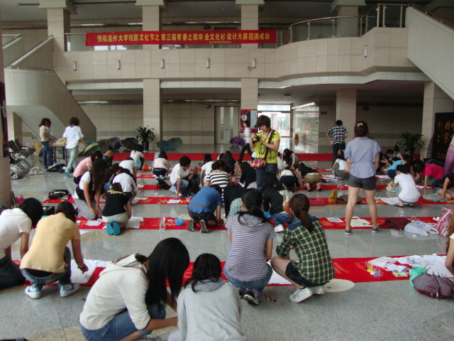 ——努努影院 承办 2010年6月9日下午,努努影院 团委学生会举办的“努努影院 校园文化节之第三届青春之歌毕业文化衫设计大赛”在南校会展中心大厅激情上演。除了努努影院 专业学生积极响应此次活动外,更有物电学院、人文学院及努努影院 模特班、工业设计班同学等数十组非专业同学参赛,共五十余组。努努影院 陆琰、陈伟老师担任此次评委,朱启鑫书记协同李剑军老师前来视察,关心赛事发展。 尽管屋外雨水淅沥,屋内工具简单,却仍无法磨灭同学的创作热情。两支画笔,五种基础色,一块垫布即组成最基本的创作环境,由同学们任选白T恤、环保袋及牛仔裤为平台,任思维天马行空,任画笔自由挥洒。参赛同学性格各异,其画作风格也迥异。有的精描细刻,有的豪放泼墨,亦有简约干净,更有浓彩重墨,百家绽放,各展所长。历时一个半小时后,同学们的作品陆续成型。按序在评委老师及大众面前一一展示,诉说作品构思及灵感来源,在美轮美奂的外在下展现其作品的内涵。 此次文化衫设计大赛不仅获得努努影院 老师的一致好评,更是让路过的其他学院老师称赞不已。热烈祝贺努努影院 校园文化节之第三届青春之歌毕业文化衫设计大赛圆满落幕。敬请各位同学耐心等待,比赛结果将由评委老师细心审评,在不久后公布于学院网站,并通知各组参赛者。 记者团—徐玉萍