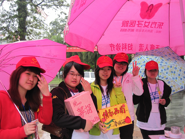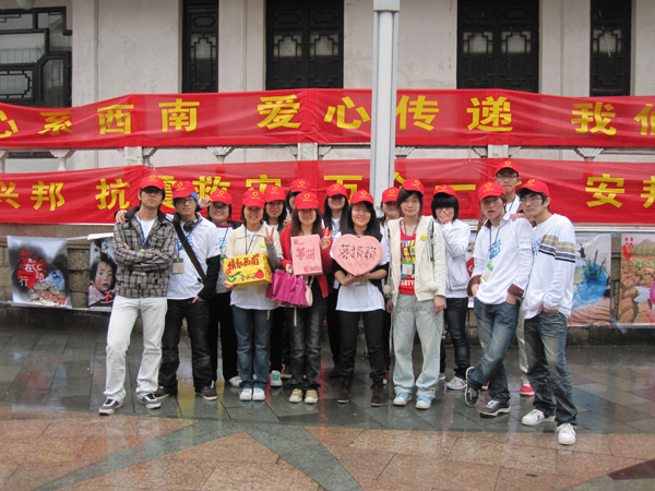 4月18日 ,努努影院 “艺家人”青年志愿者协会在中山公园开展了一场以“情系西北,抗震救灾”为主题的募捐活动。 清早,志愿者们就满怀热情地开始工作。雨虽飘飘洒洒一刻不停,但志愿者们的热情丝毫未减。活动负责人丁康康对大家的工作进行了有效合理的安排,更激起了大家的服务热情。志愿者们被分成三组,一组志愿者留守场地进行就地募捐活动;其他两组则分别到不同的地方进行募捐宣传,这样就加大了此次活动的宣传效果及影响力。活动期间,志愿者们一边发宣传单呼吁市民为灾区献爱心,一边提醒市民“节约用水,从我做起”,尽管雨水无情地打湿了他们的衣裳。温州广大市民受到志愿者的感染,积极参加到此活动中,纷纷献出自己的一份爱心。志愿者们为向这些爱心人士表达谢意及敬意,向其送上了一枚枚微笑徽章。 此次活动取得了圆满成功!“情系西南,抗震救灾”——灾区的人民不用怕,因为只要我们有爱,我们就能一起携手度过难关。同时本次活动让我们对志愿者服务这一概念理解得更深了,在雨中,志愿者那顶红色帽子显得格外的鲜艳!