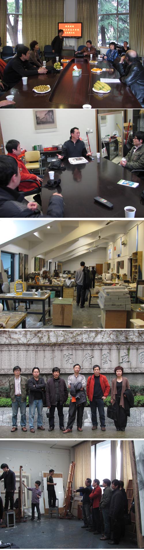 3月30日至4月2日,正值春暖花开时节。美术系蔡可群、蔡瑞蓉、邓国祥、黄良、梁力宏、黄良珽、丁海涵等七位教师,北上进行了为期四天的教学交流考察。 3月30日,第一站先到金华,作客浙江师范大学美术学院。浙师大美院教学骨干及教学副院长等人热情接待,双方进行了长达两小时的教学与办学思路交流,参观学院国画临摹室、展厅、专业教室。 3月31日早上,拜访中国美术学院油画系。由油画系主任杨参军教授带领,参观美术学院历史悠久,在国内颇负声望的四大油画工作室。杨教授绘声绘色地介绍自己的教学方法与艺术思想,令大家深感受益匪浅。 是日下午,七人又马不停蹄地前往考察杭州师范大学美术学院。校方早已开启喷泉,安排人员进行接待。管建新副院长、陆琦教授、学院书记等人在会议厅热情接待。由孔耘教授讲解,观看摄制精美的纪实录像,全面介绍杭师大美术学院的专业建设与前景规划,令人耳目一新。其办学思路是,突出绘画的品牌效应,加以设计专业的拓展,形成鲜明的办学特色。市政府与校方对美术专业的特色办学予以大力支持,学院得天时、地利、人和之势,近年发展迅速。随后,参观学院美术馆,该美术馆为杭州市的标志性建筑,设施完备,气势不凡。 4月1日早上,考察位于中国美术学院象山校区的壁画系,参观了漆艺与湿壁画工作室,特色工作室效应显著,在读的多名学生入选五年一届的全国美展。下午,拜访位于凤山路艺术创库区的杨参军绘画工作室,大家惊讶于杨教授创作的勤奋,教学相长的师者风范。 4月2日,春风和煦。满载观感与心得,七人自驾车子,越过钱江大桥,回到瓯江之畔的努努影院 。