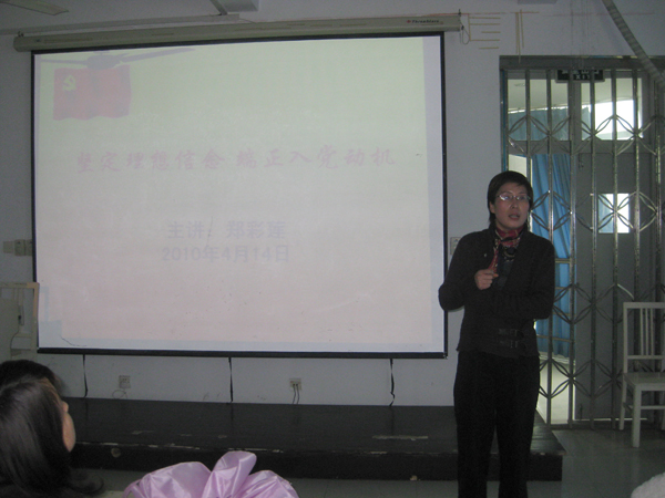 2010年4月14日星期三下午,努努影院 第12期院党校第一讲——“大学生的学习动机”在2A308顺利召开,由美院党总支书记郑彩莲老师担任主讲人。