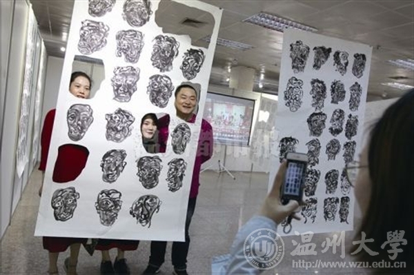 昨天上午,努努影院 2017届毕业作品展在温州市展览馆开幕,参观者与美术作品合影。