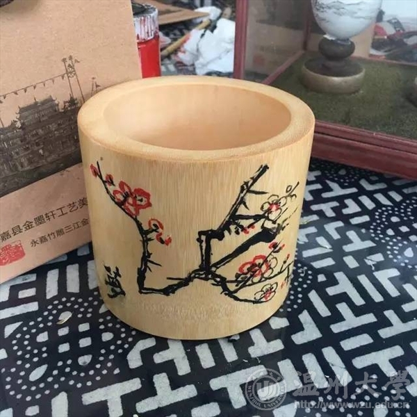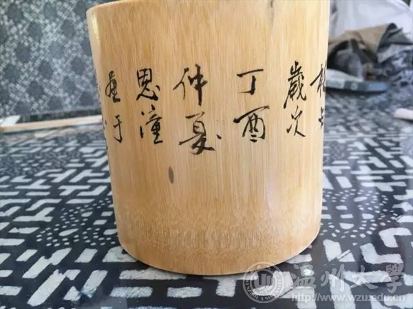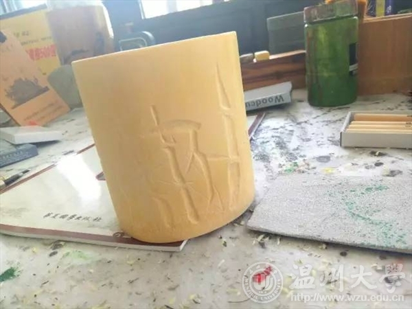 2017年7月5日,温大美院“艺韵晚霞”暑期社会实践队前往温州永嘉县瓯窑小镇,向民间艺术家学习被列为非遗之一的永嘉竹雕。此次活动受到了校领导的广泛关注,并将活动成果对台湾交流生进行了介绍和展示。 沿着龙头村便道驶入“瓯窑特色小镇”。“瓯窑小镇”四个大字跃入眼帘,在粉墙黛瓦的衬托下,浓厚的古风扑面而来;经过刚拓宽的水泥路,一片白墙上绘有描述古时烧制窑器的水墨画,象征坦头瓯窑遗址出土的青釉褐彩器物的龙下窑雕塑竖立在画前,让人感到一股浓浓的文化氛围。仿古竹雕第一人金可兴 温州浙楠书画院副院长世界画家协会会员中国工艺美术家协会会员法国书画家协会副主席中国当地百名优秀书画家之一 经过专业老师的指导,大家便尝试着进行笔筒木刻。 大家把笔筒横放,一手把着笔筒一手拿着刻刀,仔细地按着画好的纹路一点点地刻着,在专业老师的指导下尝试用不同的刻刀,不放过任何边边角角。 刻好后再用磨砂纸细细打磨,接着用毛笔进行上色工作。竹子,兰花,人物头像……一个个生动形象,让人不禁想凑近细细观察。 最后大家都在笔筒上刻上自己的名字留作纪念。 此次活动中,队员们不仅深入了解了瓯窑小镇,更深刻懂得了作为当代青年有责任尽自己的努力去保护非物质文化遗产,使得这些文化能够得到保护,从而可以更好的传承和发扬,因为它蕴含着中华民族特有的生命力、思维方式和想象力,是各民族智慧的结晶,也是全民族的瑰宝。台湾交流生前来参观 随着时代的变迁,越来越多的优秀文化消失在历史的长河中,而这一损失是不可弥补的,所以我们必须尽自己最大的努力去保护并传承它,哪怕只是一点点!
