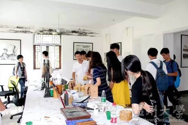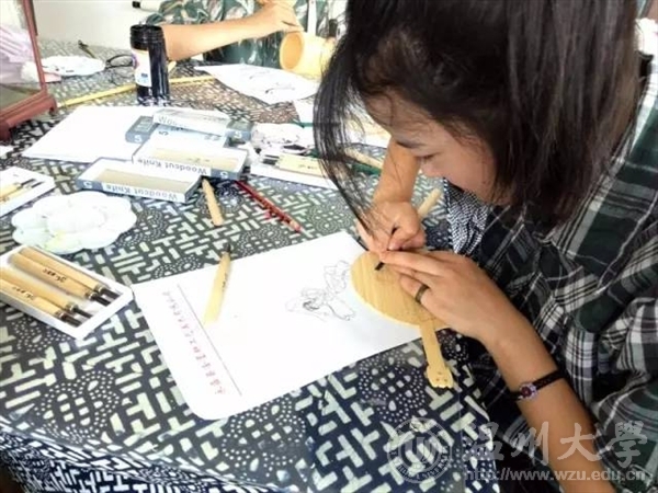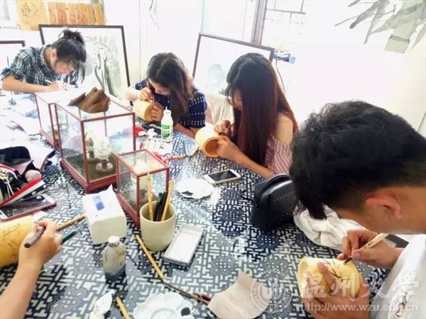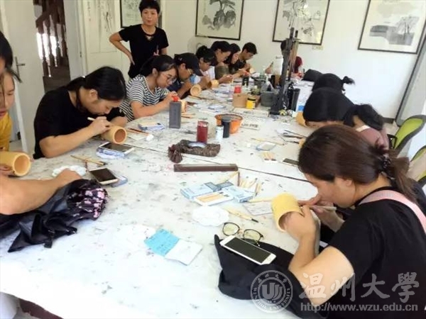 2017年7月5日,温大美院“艺韵晚霞”暑期社会实践队前往温州永嘉县瓯窑小镇,向民间艺术家学习被列为非遗之一的永嘉竹雕。此次活动受到了校领导的广泛关注,并将活动成果对台湾交流生进行了介绍和展示。