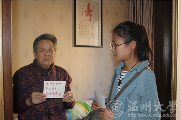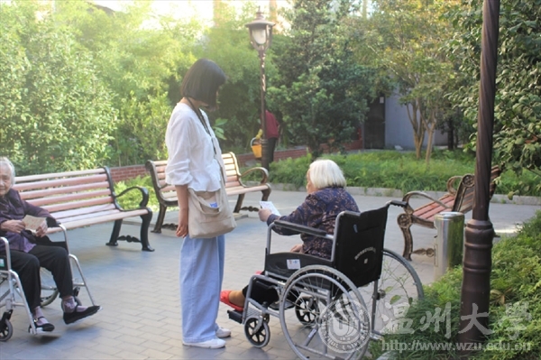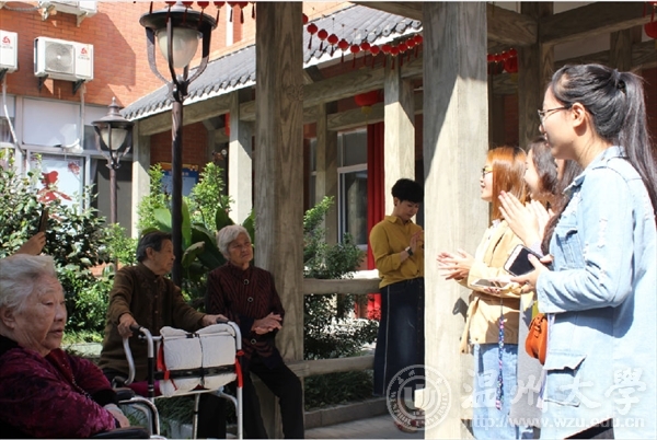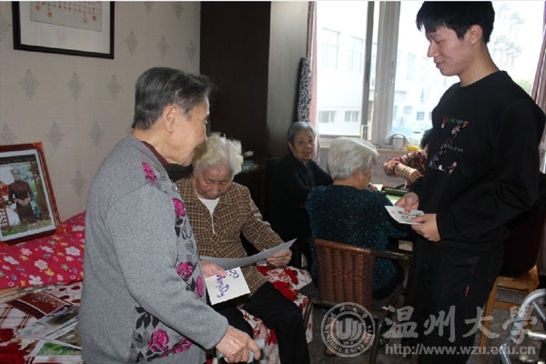 2017年10月28日,温大努努影院 “艺家人”青年志愿者协会于上午8点30分在E区门口集合,前往名盛敬老院开展重阳节关爱老人志愿服务活动。本次活动在欢声笑语中拉开序幕,志愿者为老人们表演了精心准备的节目,让敬老院的气氛一下子欢快了起来,精彩的演出赢得了老人们的掌声和称赞,现场其乐融融,老人们在台下也开始愉快地哼起了小曲。一个个精彩的表演过后,老人们也渐渐熟悉了志愿者,开始拉着志愿者们在院子里散步谈心,说年轻时的自己,说他们爱的家人,说他们所认识的人生,也许没有多少传奇的故事,但他们的体会,让志愿者们对人生有了新的认识,志愿者们也向老人们分享校园趣事,引得老人们哈哈大笑。有一些腿脚不便的老人,志愿者们则推着轮椅,停停看看,惬意自在。为了让老人们生活地更舒服些,志愿者们走进了老人们的房间,帮助他们清扫房间,甚至有些狭小角落也被志愿者们打扫地干干净净,一点一滴的行动证明着我们志愿者的爱心。在这温馨的午后,志愿者们又给老人们送上了为他们做的重阳节明信片,美好的时间过的格外地快,志愿者们依依不舍地与老人们分别,结束了本次的实践活动。本次活动开展的目的在于给敬老院的老人们带来像家人一样的温暖和陪伴,即便这些老人不常在节日里与家人们团聚,但相信志愿者们给出的关怀与问候也能让这个温暖的节日更加温暖,同时也希望借此来呼吁同学们能多关爱老年人这一群体,多给予他们关心和照顾。想对那些老人说:我们会经常来这里看你们,和您手说生活中的琐碎,让您回忆起儿时的趣事;我们将会是视你们为至亲的亲人。让我们期待下一个的志愿活动,把更多的温暖传递出去! 图/文:罗会慧董 悦金 哲