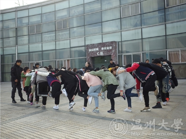 团干第一次户外培训活动在周日下午如火如荼的展开。突如其来的冷空气也阻挡不了同学们的热情。同学们在大学生活动中心依次排好等待培训的开始。一个成功的队伍必须拥有炫酷的队名响亮的口号和统一的队歌。同学们在短短十分钟内发挥想象在大卡纸上刷刷画下了队名和图案,并在完成后在各个队伍前展示。第一个项目是兔子舞同学们整齐的排成一个圈,接受重重挑战。这个项目不仅挑战了同学们的协调性也考验了大家的反应能力。在活动中反应不够灵敏的同学接受惩罚时也引起了同学的爆笑。从第二个项目开始,同学们分为两组分别进行活动。其中一二队同学进行的项目是挑战五分钟。同学们一个接一个用手中的管子运输小球,通过指压板,将小球投进篮中胜利。接下来一连串的项目都是靠大家齐心协力才能完成,默契最佳的组才能获胜。三四组同学的项目是贪吃蛇,两队除了蛇尾外的同学都带上了眼罩,在黑暗中,位于蛇头的同学在地上摸索着散落的木块,项目的关键就在于蛇尾同学的指挥和蛇身同学们的传达,一个协调的整体才能取得成功。接下来一二两组的项目是信任背摔。同学站在一米以上的站台上克服内心的恐惧,往后笔直一摔让背后搭成人桥的同学接住他才算成功。这一项目考验了同学们间的信任度与勇气。三四两组进行的是团队运输,将报纸做成履带同学们作为轮胎在起点与终点间运输气球,同学们默契配合,才能在短时间运输完成。最后一个项目是一方有难八方支援,同学们发挥出无私奉献的精神,应要求纷纷奉献出自己的衣服、鞋子、袜子、甚至是自己。在热火朝天的氛围中,培训画下了完美的句号。在此次培训中,团干们在互动中增进了情感,在比赛中培养了团队协作精神与默契度。相信团干培训活动会越来越顺利。