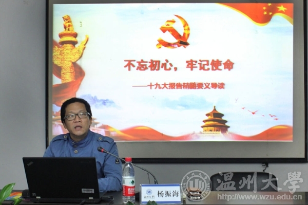 杨书记对十九大报告的主题、过去五年的工作和历史性变革、新时代中国共产党的使命、新时代中国特色社会主义思想和基本方略等十三个方面以及十九大的意义进行了详细分析和讲解。在杨书记的细致讲解下,同学们都获得了深刻的感悟与体会。杨书记指出,党的十九大是在全面建成小康社会关键阶段、中国特色社会主义发展关键时期召开的一次十分重要的大会,对鼓舞和动员全党全国各族人民继续推进全面建成小康社会、坚持和发展中国特色社会主义具有重大意义。作为高校学生干部学习和践行十九大精神的目的,是要不忘初心,牢记使命,努力充实文化知识和专业技能,为实现中华民族伟大复兴的中国梦贡献自己的力量。