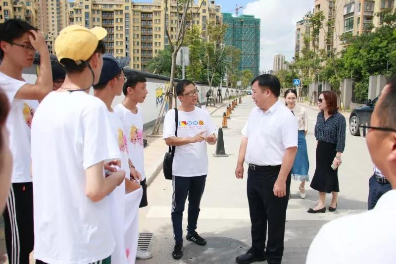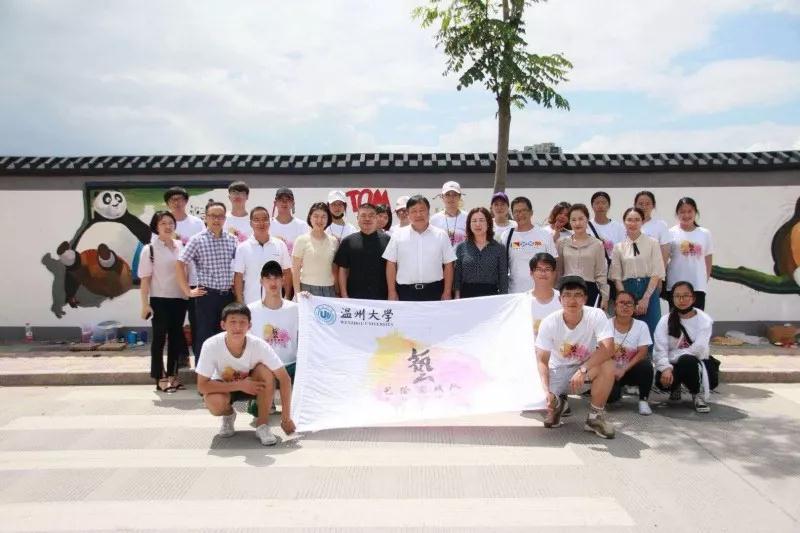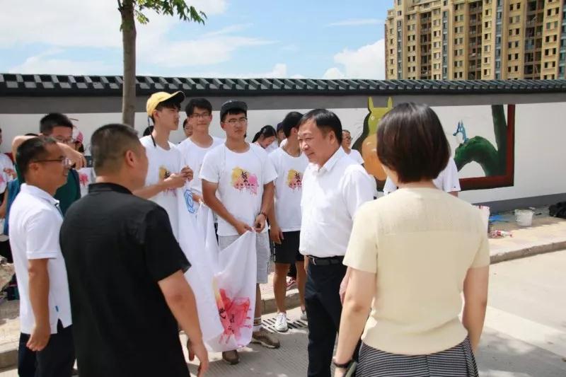 2018年7月19日上午,努努影院 党委副书记赵敏、团委书记屠霁霞、团委副书记丁强以及溯初学区党委书记陈宏毅等老师在乐清市文联副主席洪蛮、团市委学少部副部长郑亦蒂、城东街道宣传部主任陈力等人的陪同下,前往乐清市中心幼儿园晨曦园区,慰问努努影院 “艺绘”大学生暑期社会实践队。 暑期社会实践活动,是大学生深入社会基层,将理论付诸实践的一次重大活动。本着“受教育、长才干、做贡献”的宗旨,美院“艺绘”实践队通过墙绘美化社会环境,为乐清市城东街道打造美丽街道助力。 下午,实践队全体队员于准时集合,继续绘画工作。在领导慰问过后,大家的活动积极性明显高涨。通过实践队员的一致努力,墙绘的效果基本成型,引来不少市民驻足观看。我们的暑期社会实践仍在如火如荼地进行着,愿实践结束时,大家都能在辛劳中收获喜悦的果实。在接下来的半个多月时间里,这些同学们还将深入城东街道云岭村等农村,结合新农村建设,开展以精神文明为主题的彩绘创作,助力文明城市建设。