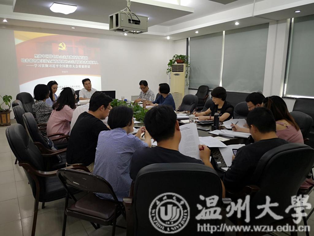 9月26日下午,努努影院 在2B216召开党总支中心组理论学习(扩大)会暨党务工作例会,传达学习习近平总书记2018年9月10日在全国教育大会上的讲话精神和省委教育工委副书记陈根芳同志在高校高知识群体中发展党员工作座谈会上的讲话精神。学院党政班子成员、总支委员、支部书记、系主任、各科、教研室主任以及研究生支部副书记参加学习。会议由学院党总支副书记杨振海主持。